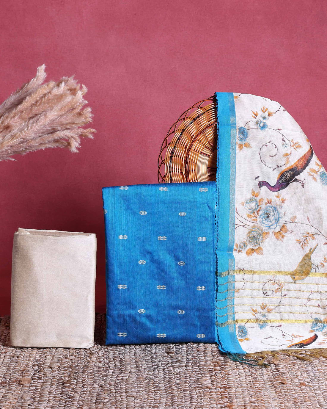 Women’s Unstitched Salwar Suit Material Set with Woven Butti Top 2.5 Mtr, Solid Pant 2 Mtr & Floral and Bird Printed Dupatta 2.25 Mtr - Blue