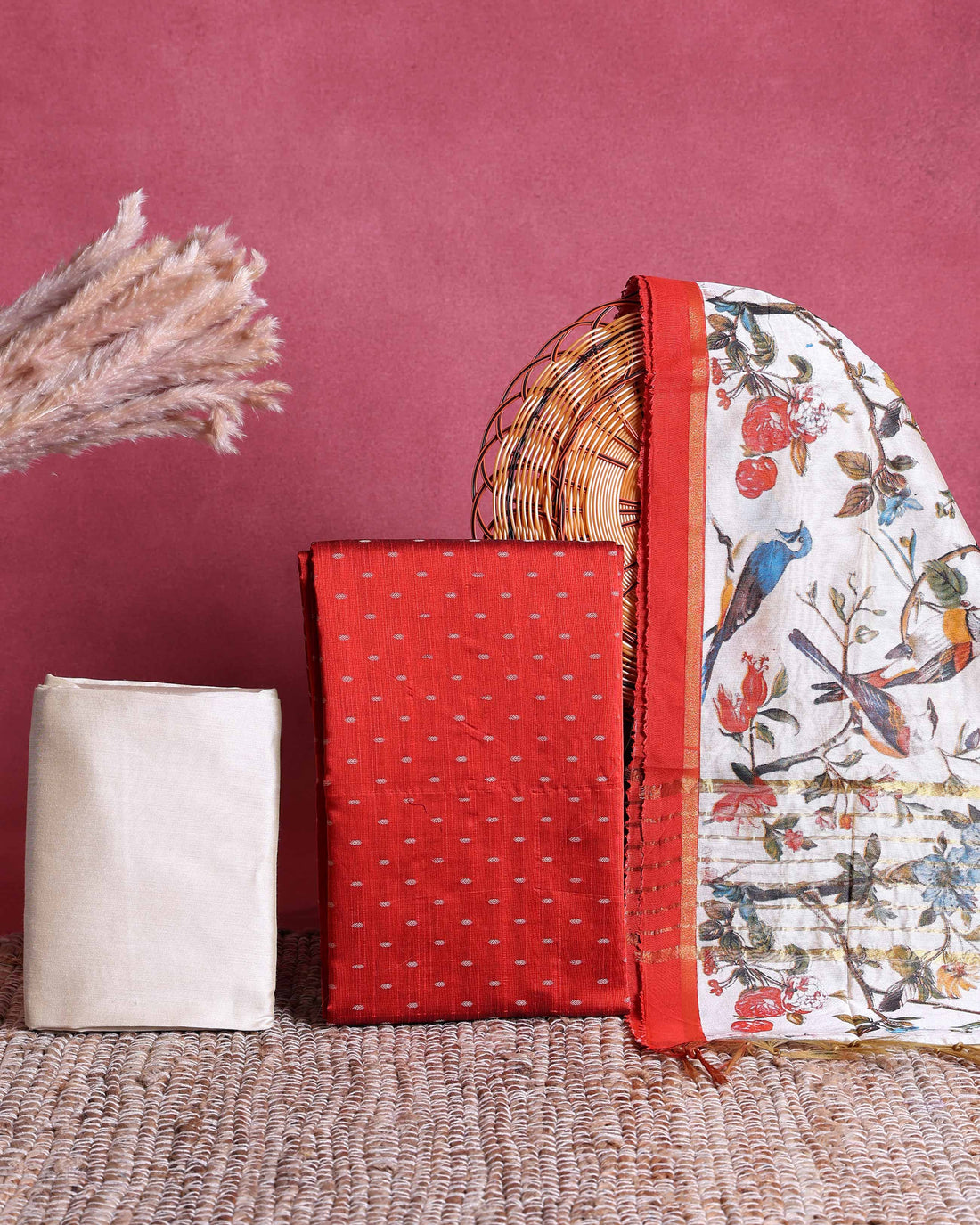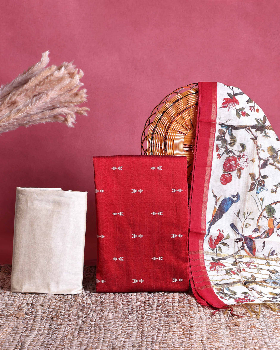 Women’s Unstitched Salwar Suit Dress Material Set with Woven Butta Top 2.5 Mtr, Solid Pant 2 Mtr & Printed Dupatta 2.25 Mtr - Red