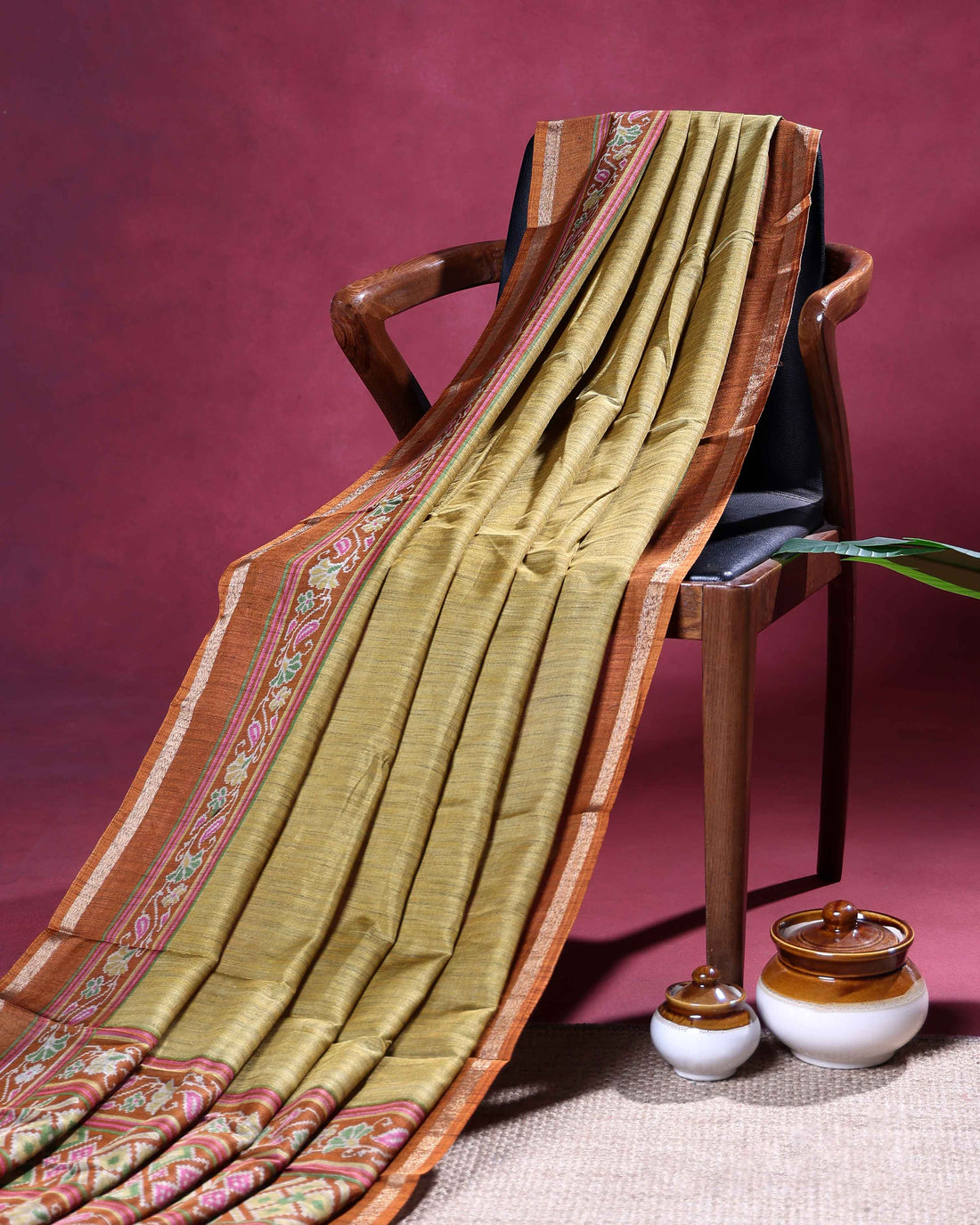 Elegant Semi Tussar Saree with Contrast Woven Border and Traditional Floral Vine Design - Golden Yellow