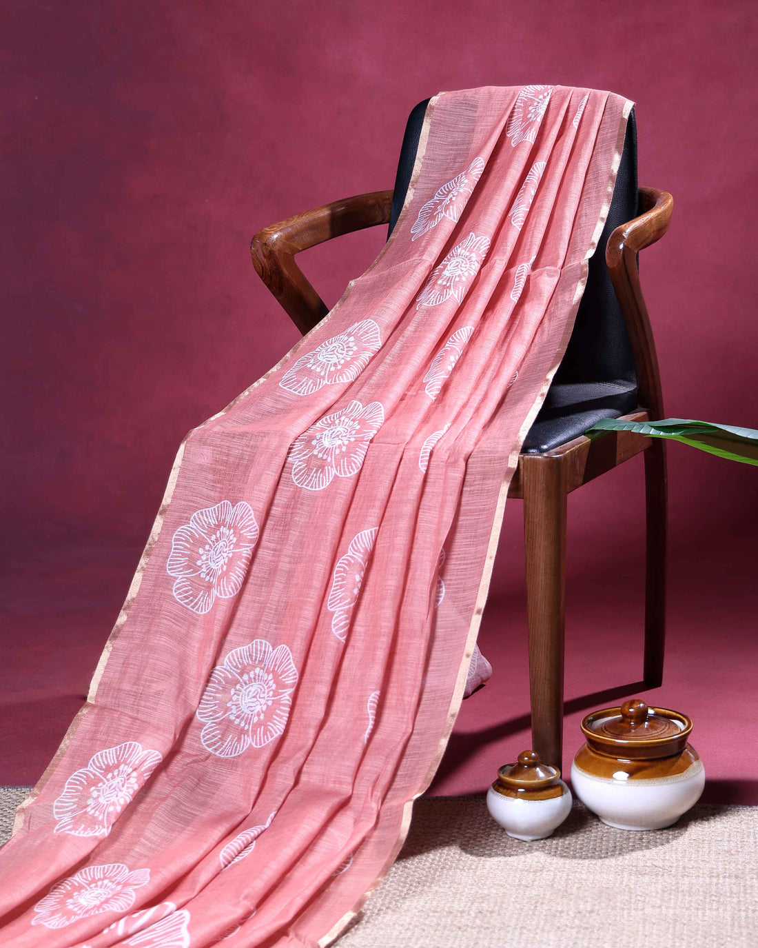Elegant Linen Blend Saree with Large Floral Prints and Woven Border - Peach