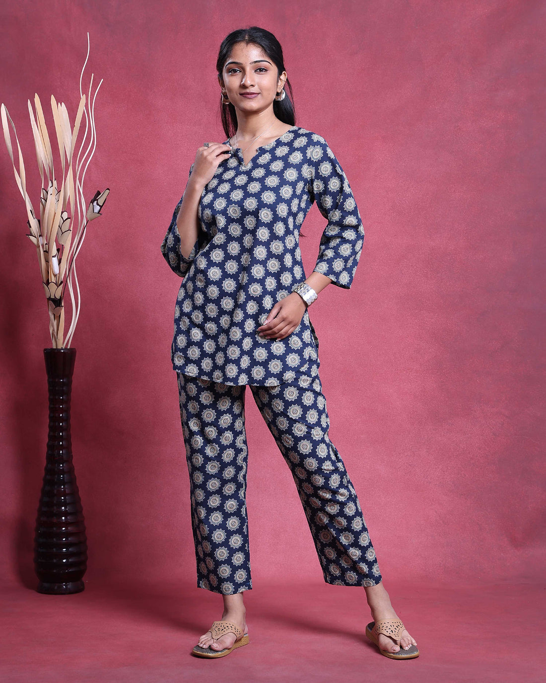 Women’s Stylish Printed Nightwear Co-Ord Set with Relaxed Fit Top and Full Length Pants - Blue