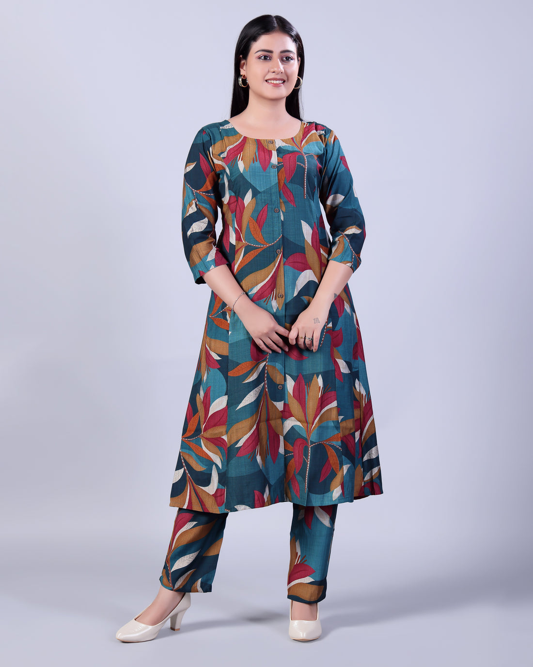 Contemporary Leaf Printed A-Line Kurta with Straight Palazzo - Multi