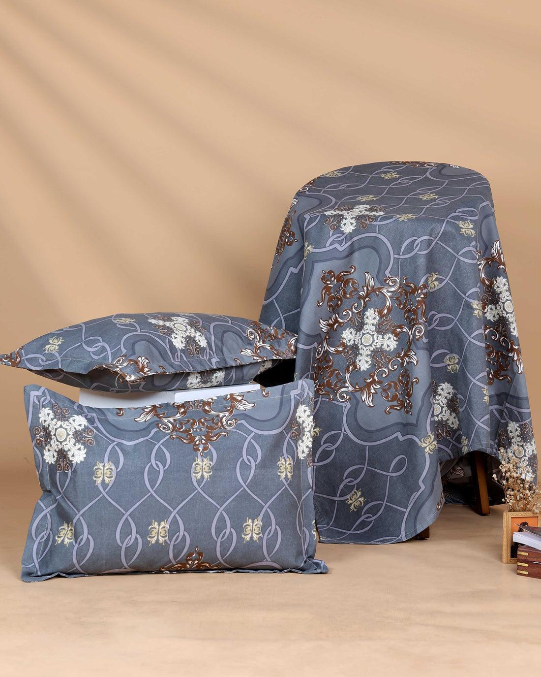 Elegant Intricate Pattern Bed Cover with Matching Pillow Cover Set - Dark Grey