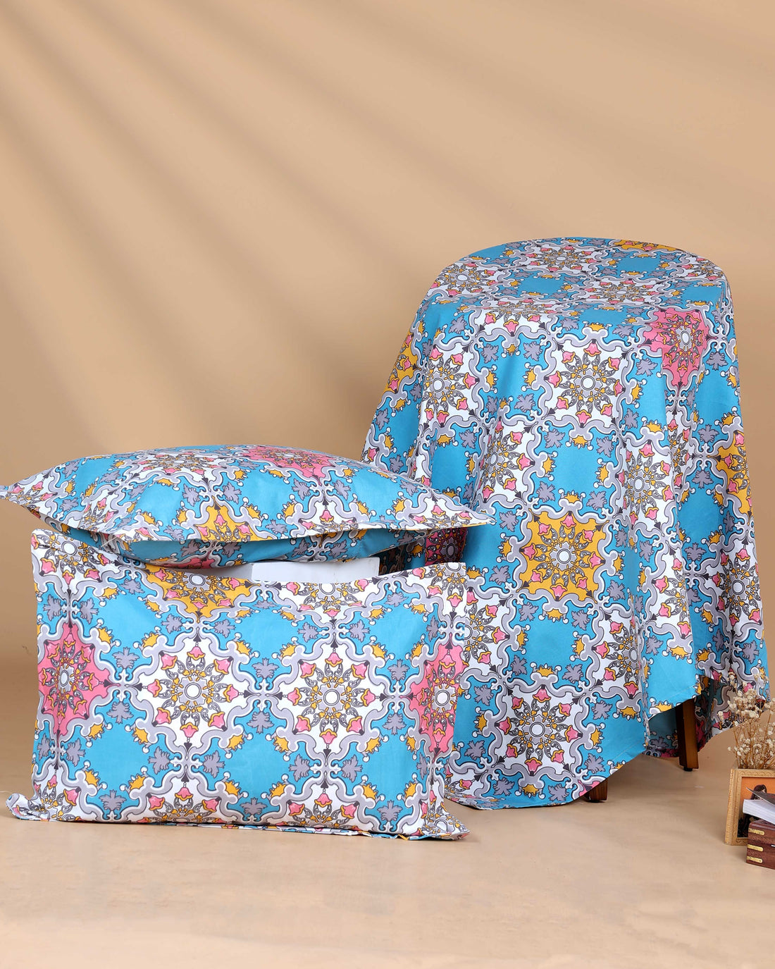 Elegant Intricate Print Design Bed Cover with Matching Pillow Cover Set - Blue