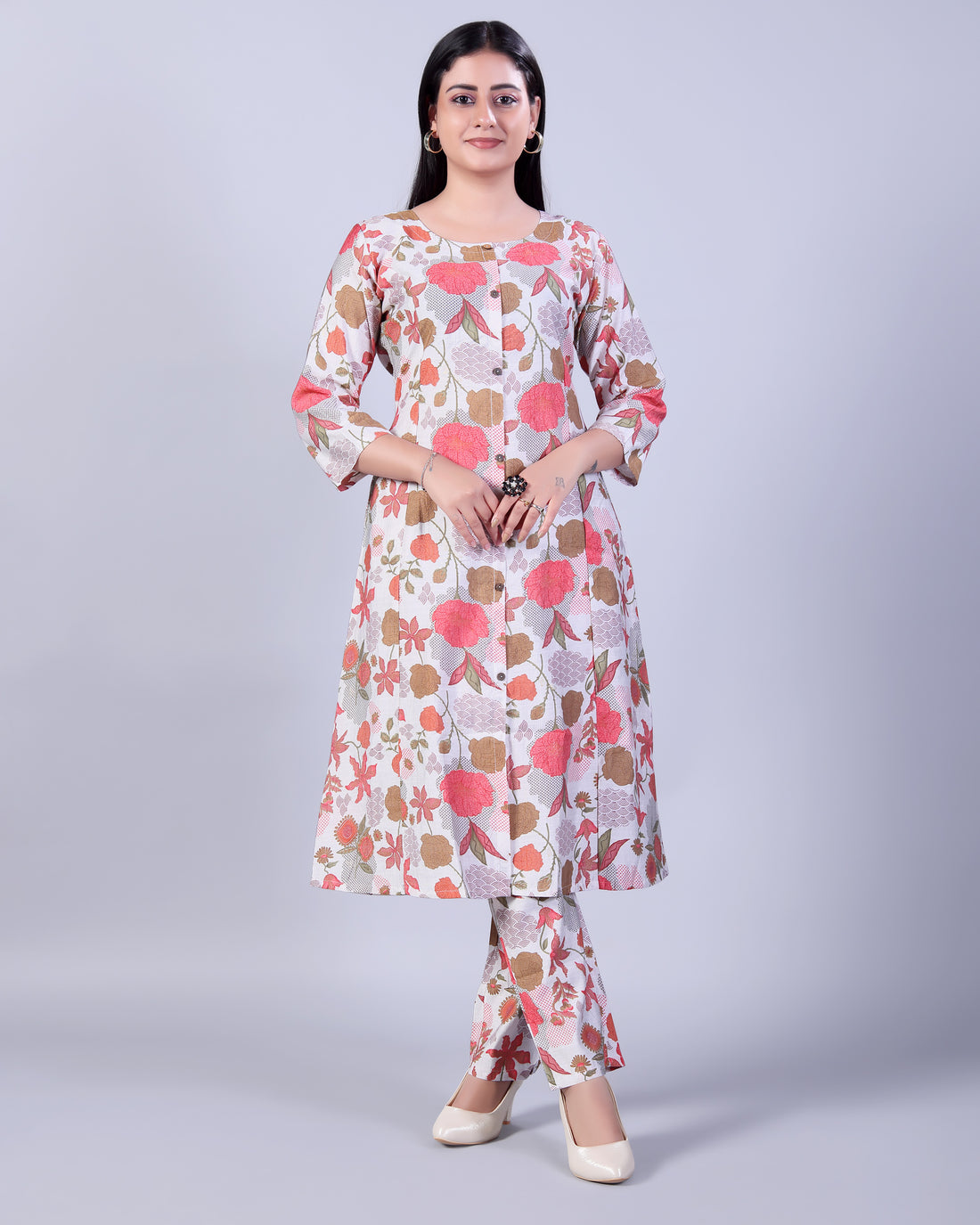 Bold Floral Printed A-Line Kurta with Matching Straight Palazzo - White