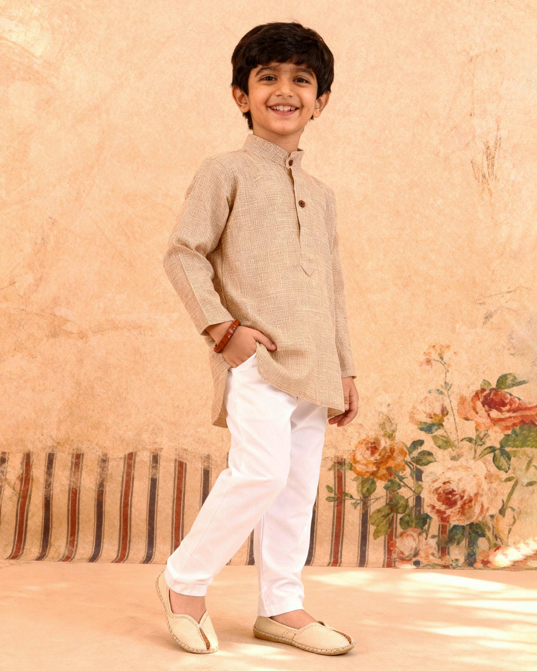 Boys Floral Printed Festive Kurta Set with Mandarin Collar - Sandal