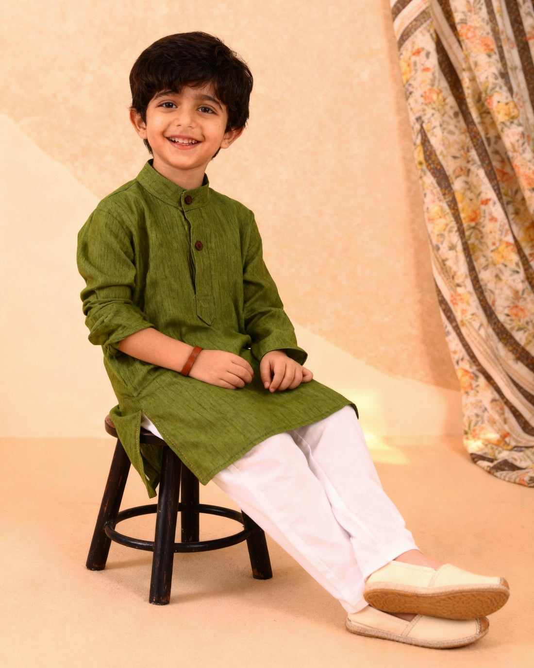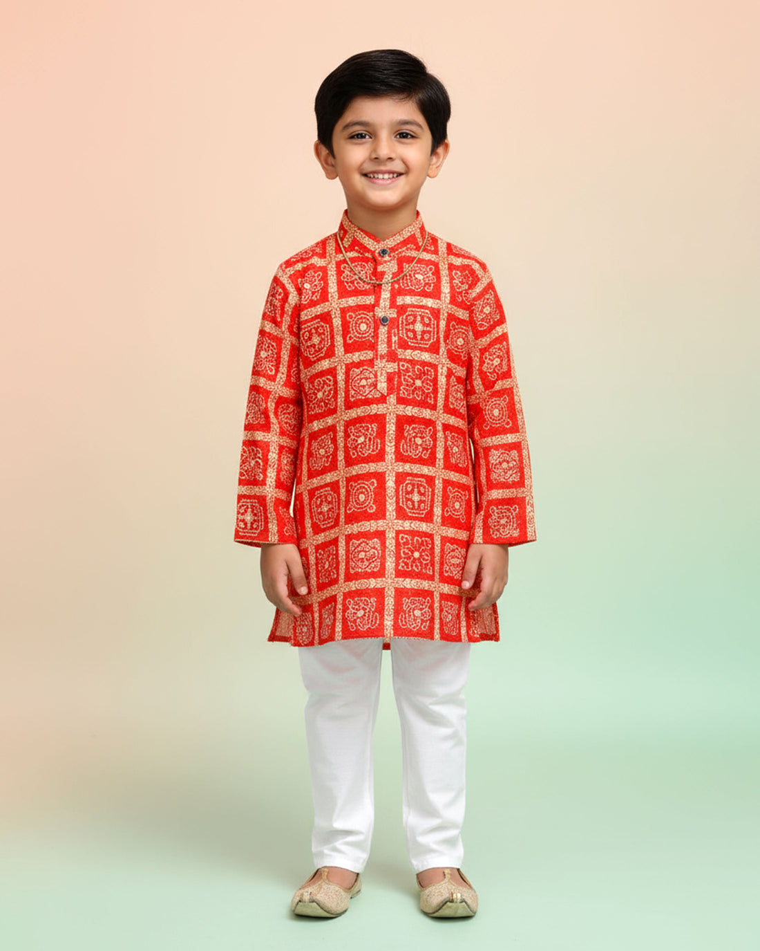 Boys green kurta adorned with traditional Bandhani-inspired patterns in red and gold.