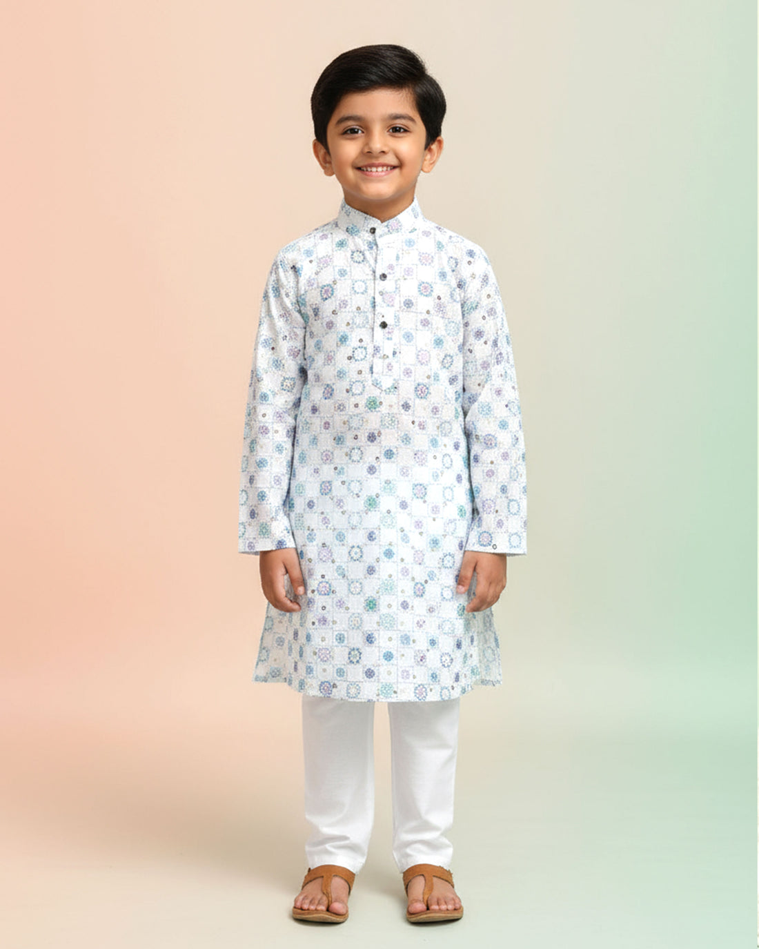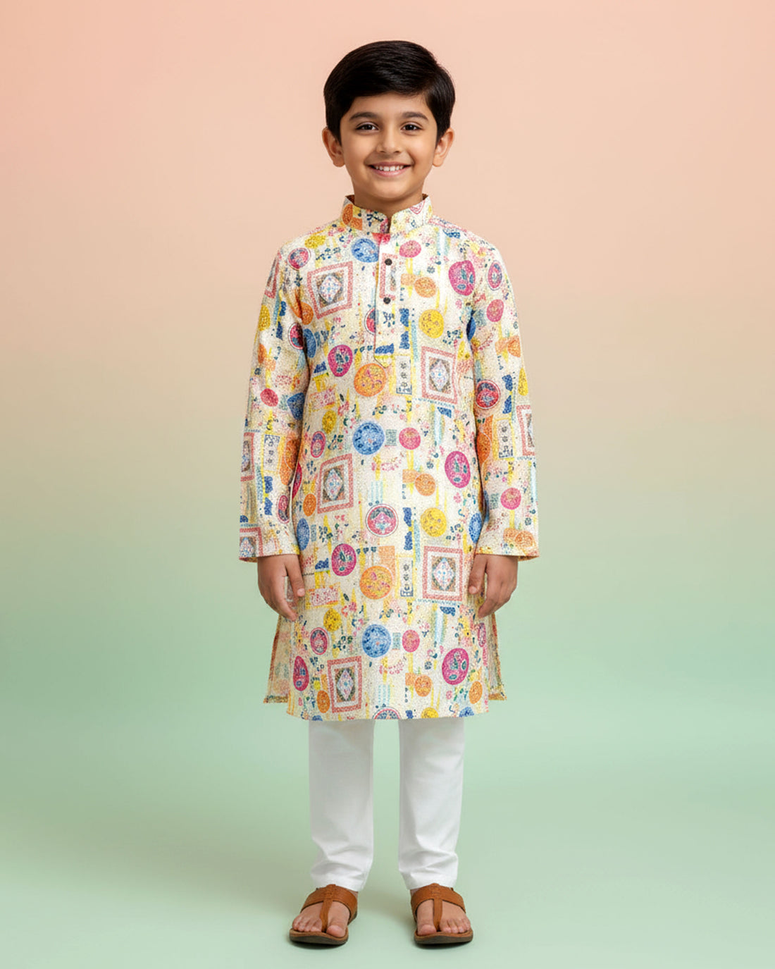 Boys Festive Cream Kurta Set with Multicolor Mandala & Frame Print
