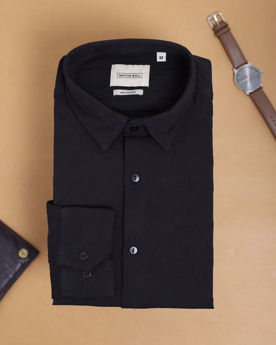 Nativebull Men's Casual Long Sleeve Collared Shirt with Textured Weave Detail - Black