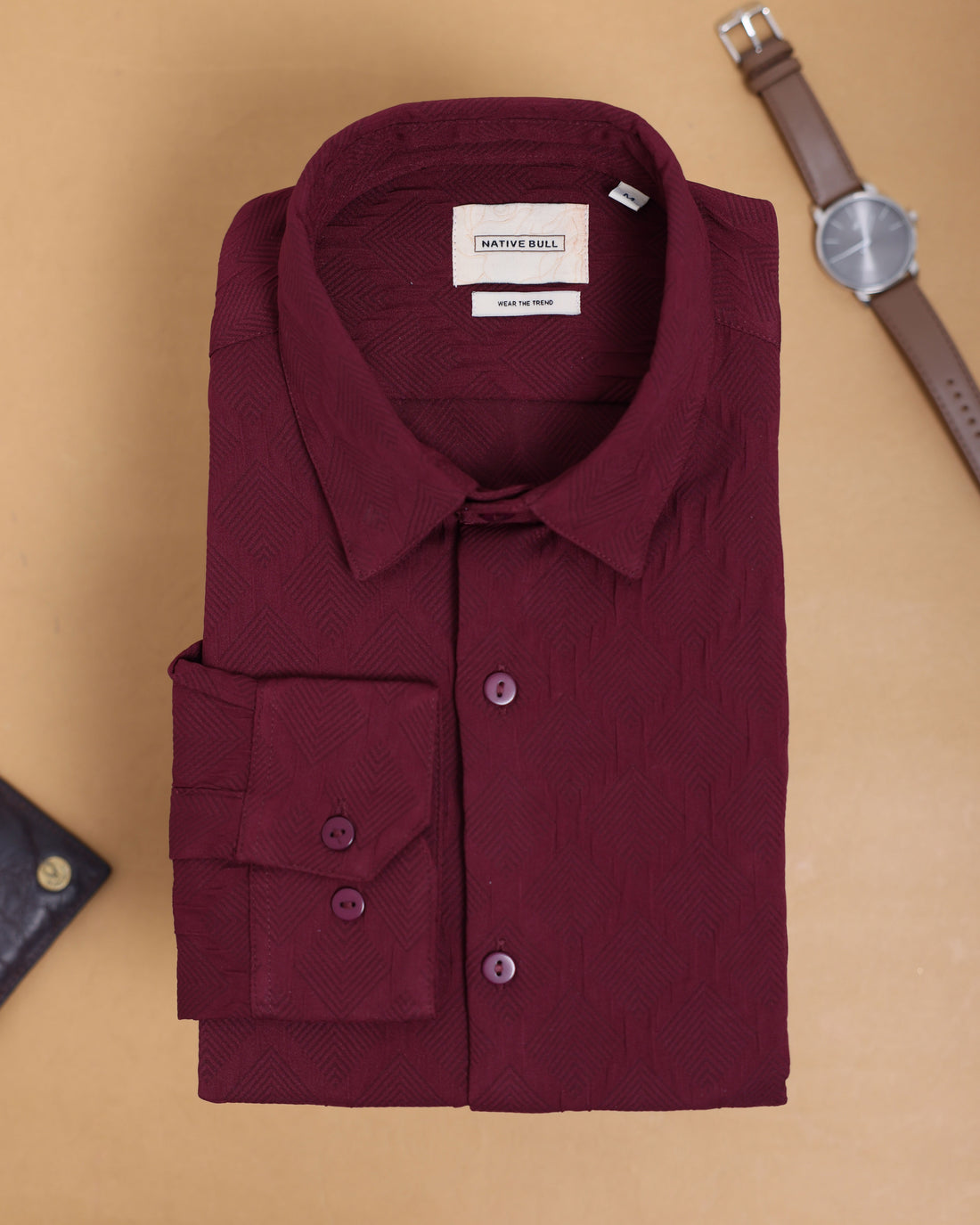Nativebull Men's Casual Long Sleeve Collared Shirt with Textured Weave Detail - Maroon