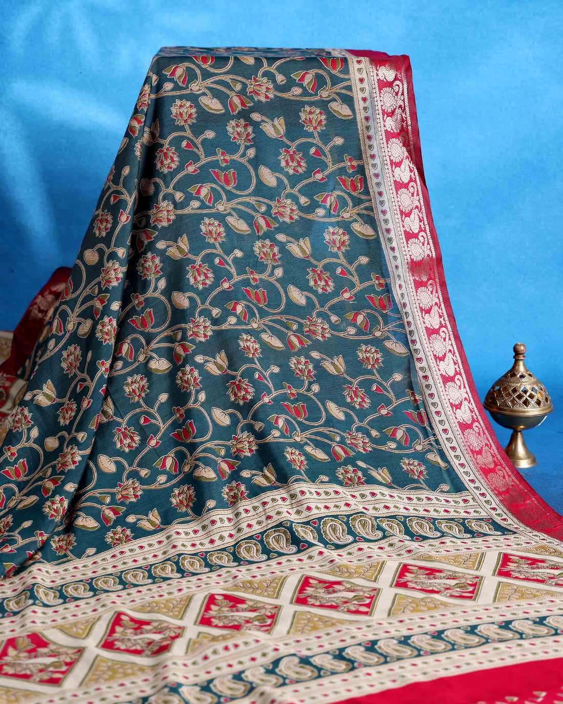 Ethnic Blue Semi Chanderi saree with Multi-color Paisley and Floral Design