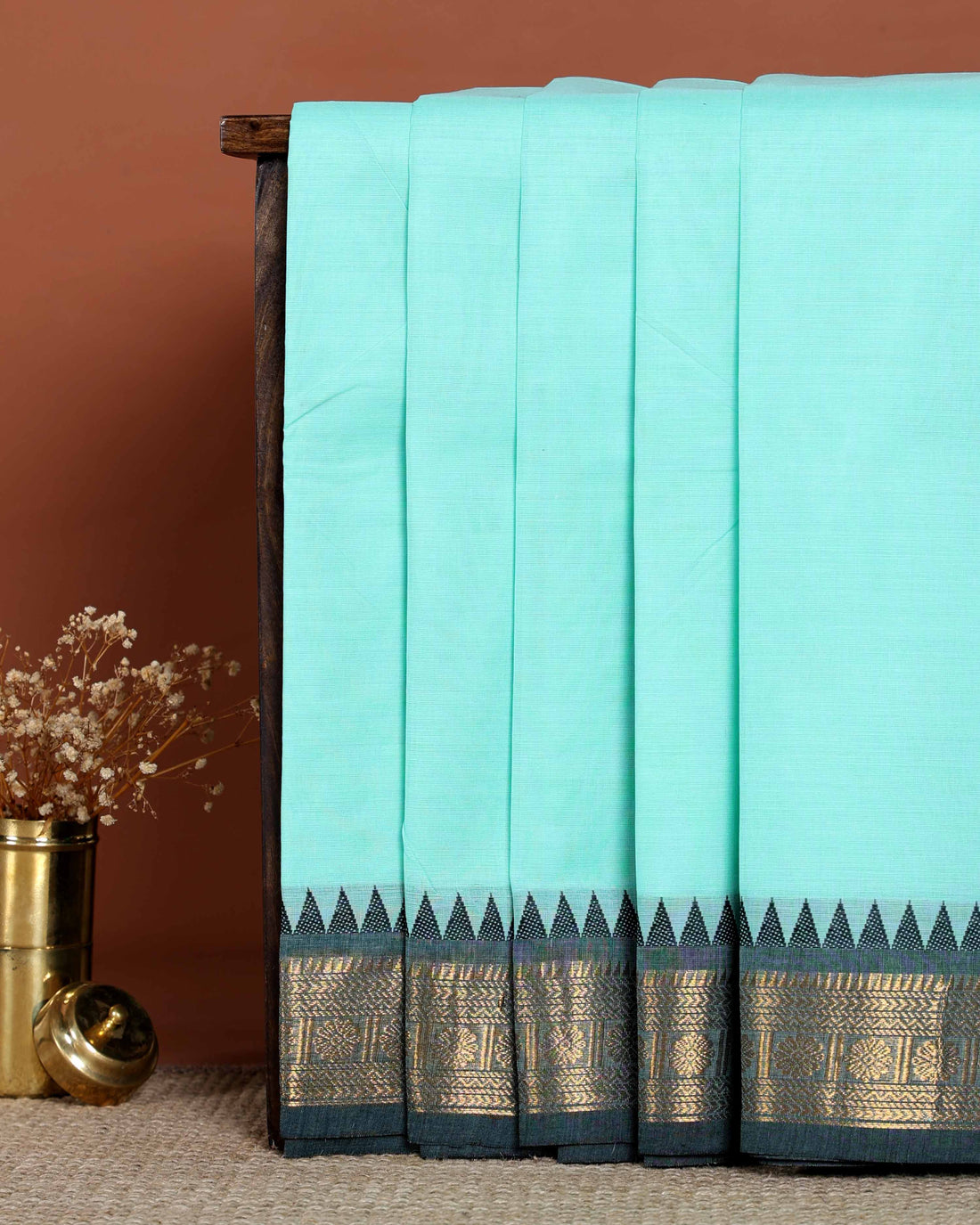 Traditional Handloom Chettinad Cotton Saree with Intricate Zari Woven Border and Classic Geometric Pallu Design - Turquoise Blue