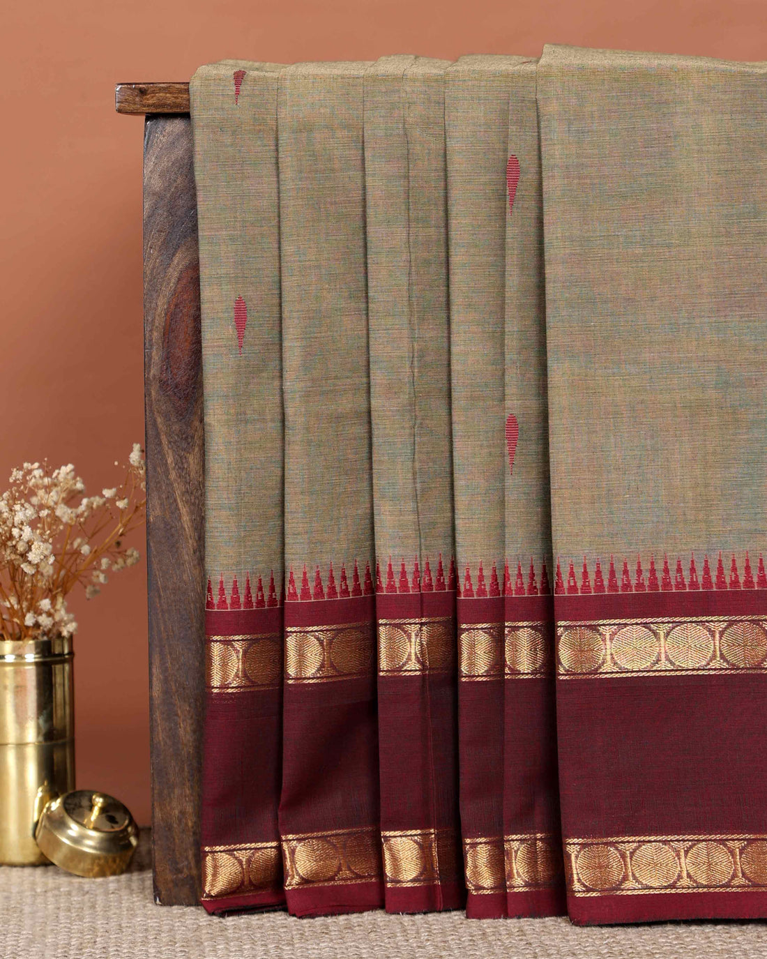 Traditional Handloom Chettinad Cotton Saree with Zari Woven Temple Border - Olive Green