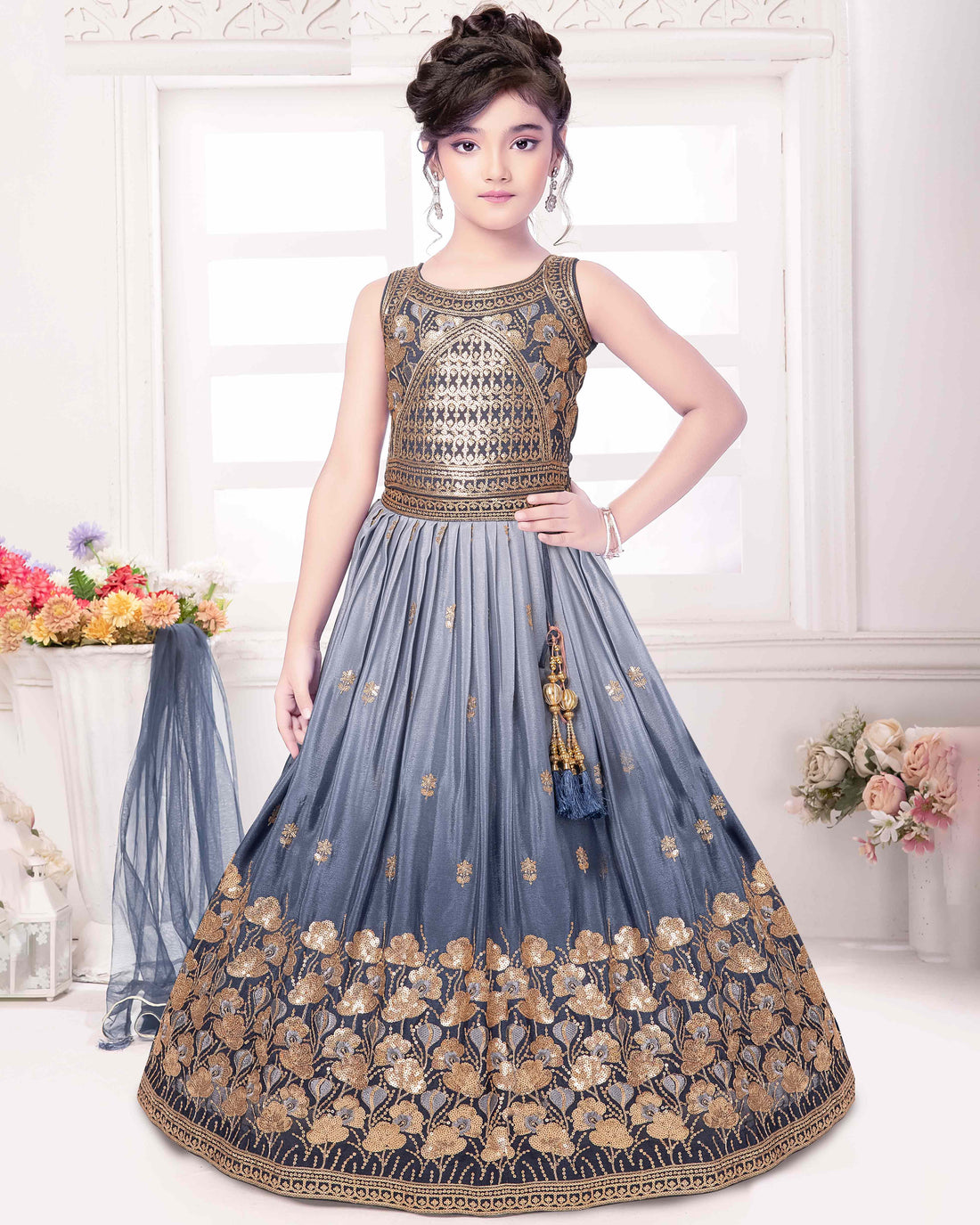 Girls Kids Embellished Sleeveless Choli Dress with Zari Work - Grey
