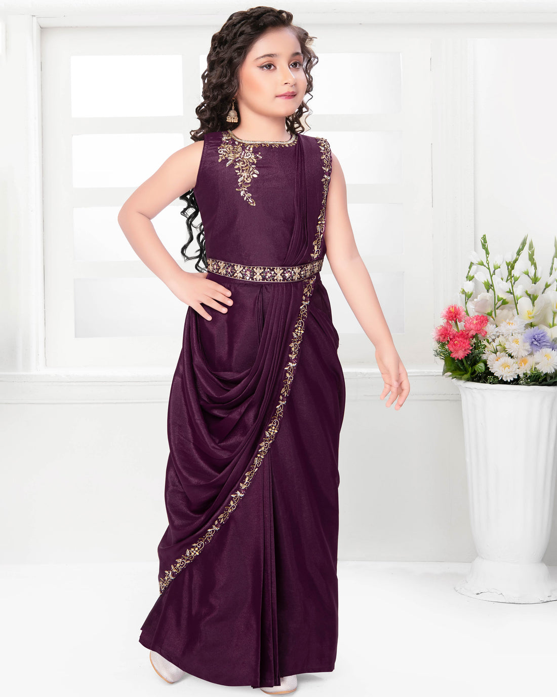 Girls' Readymade Embroidered Sleeveless Lehenga Choli with Belt and Draped Skirt -Purple