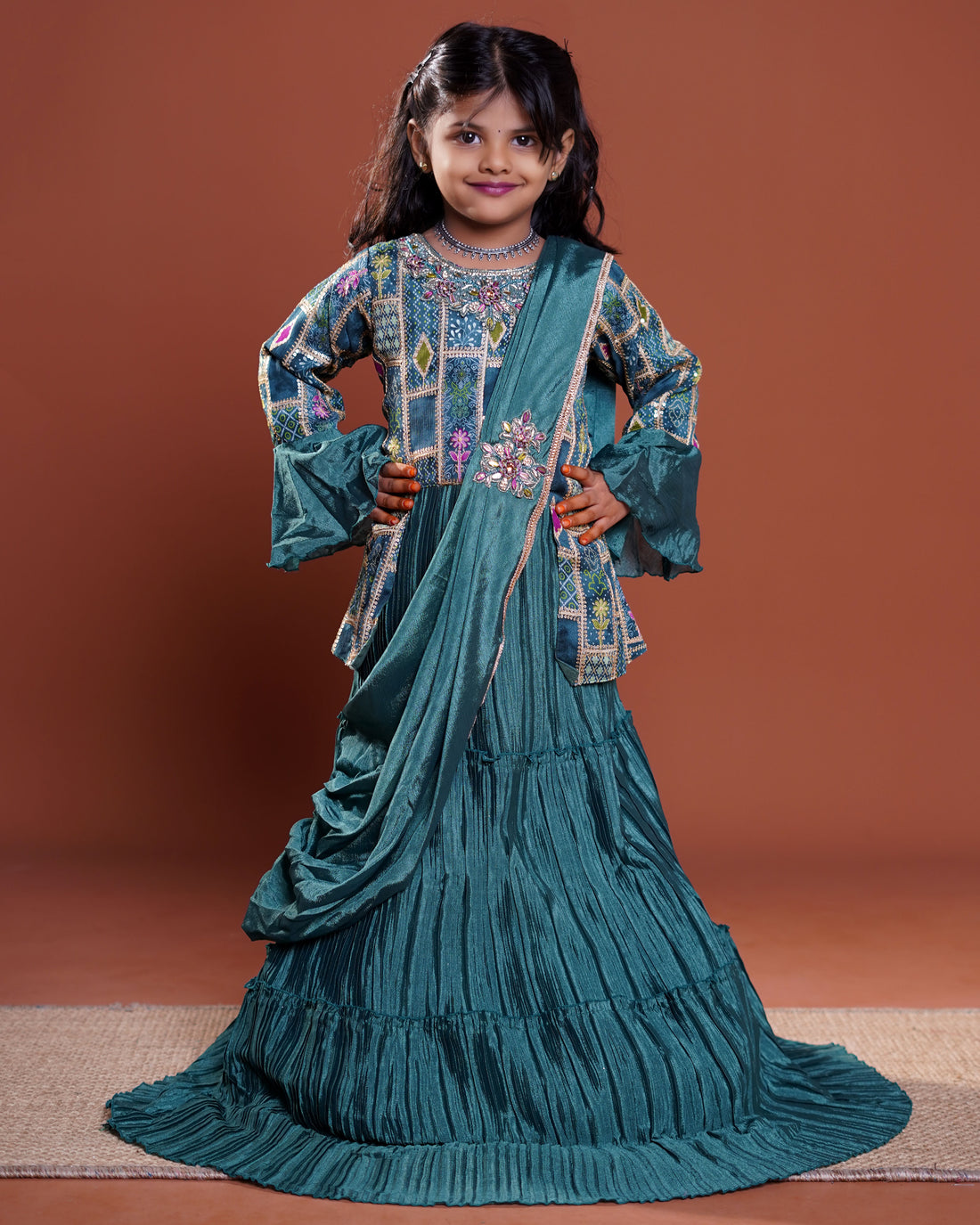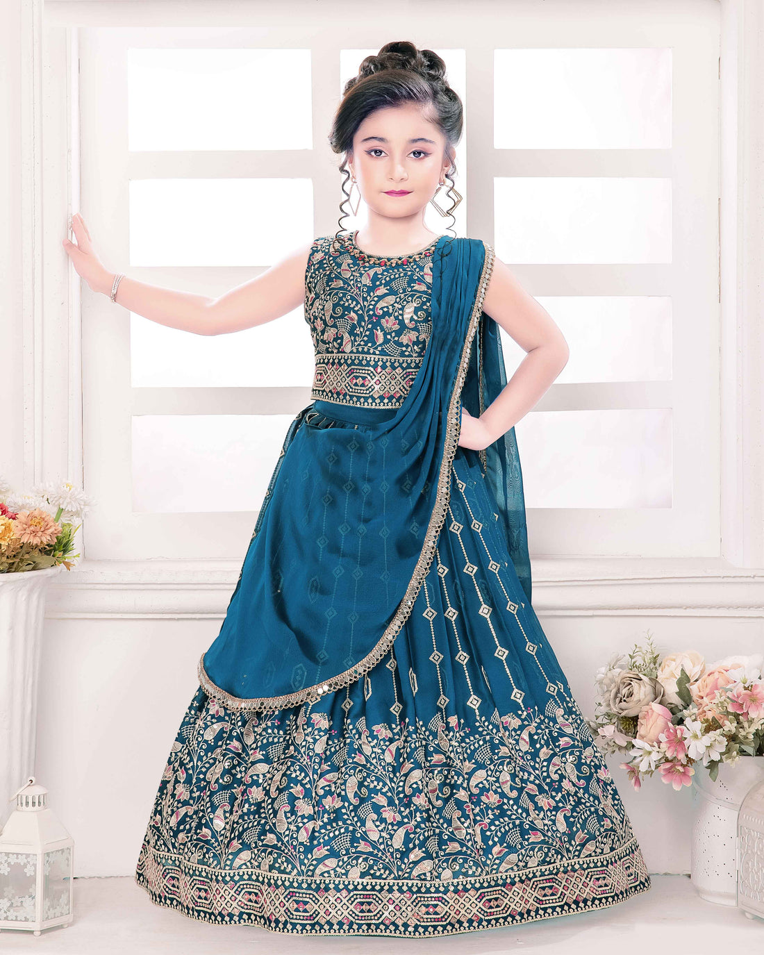 Girls Ethnic Wear Lehenga Choli Set with Intricate Embroidery & Sequins - Teal Blue