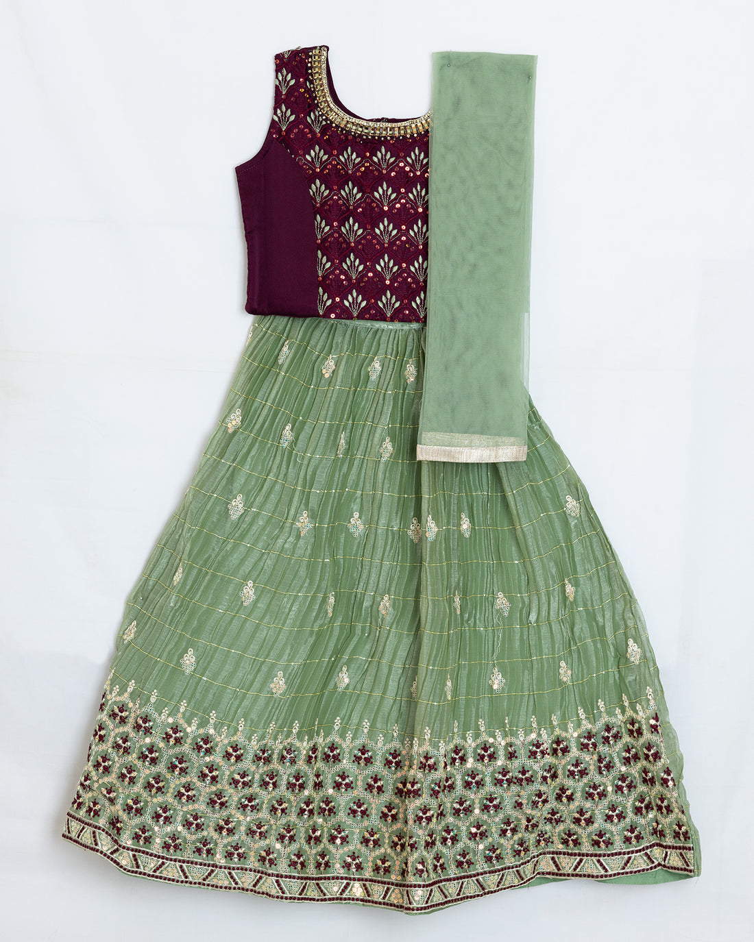 Girls Embroidered Net Lehenga Choli with Dupatta Set - Green