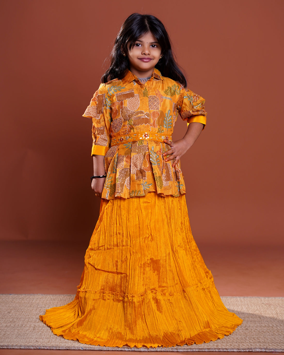 Girls Ethnic Printed Peplum Top & Pleated Skirt Set with Ruffled Sleeves Kids Choli - Yellow