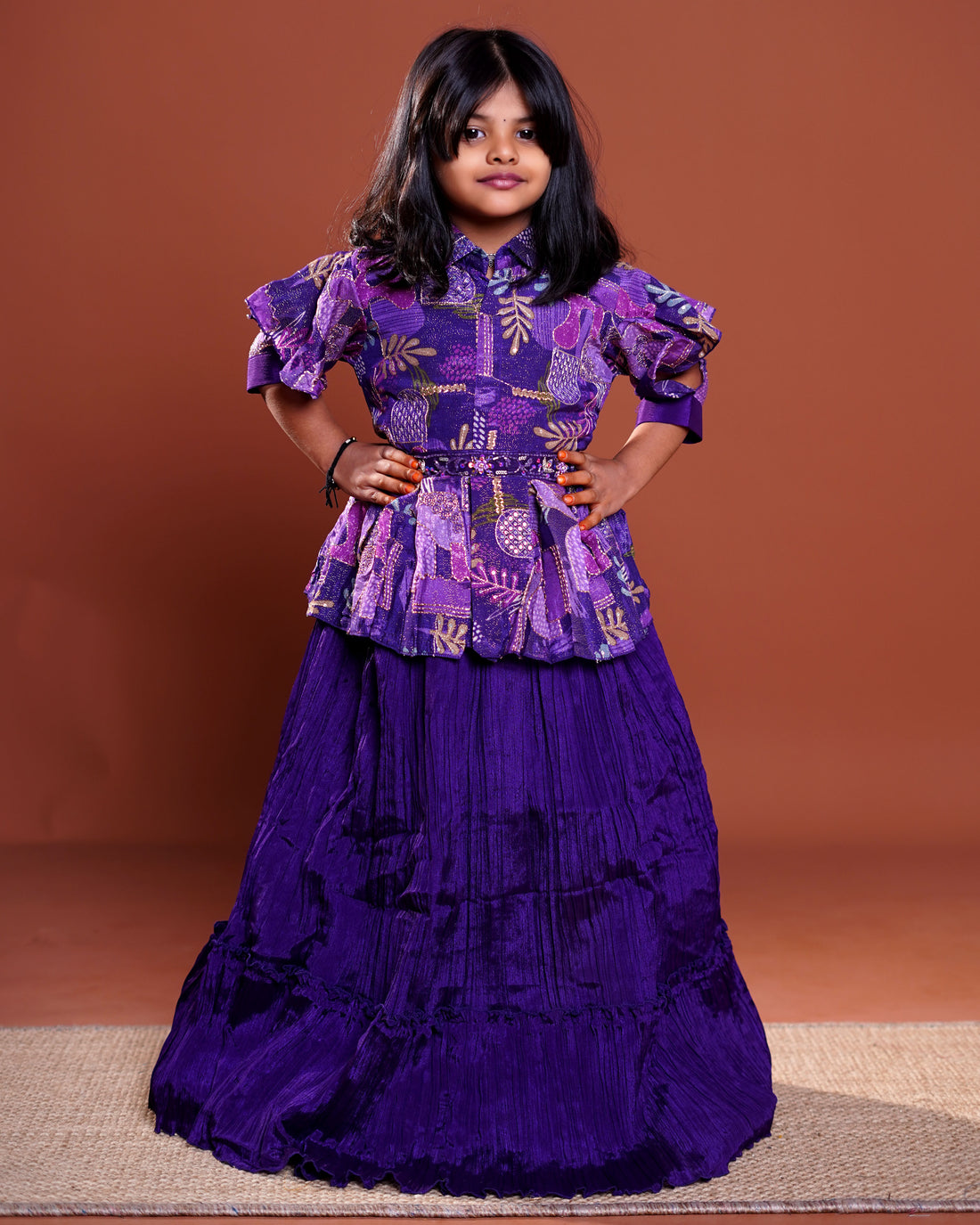 Girls Ethnic Printed Peplum Top & Pleated Skirt Set with Ruffled Sleeves Kids Choli - Purple