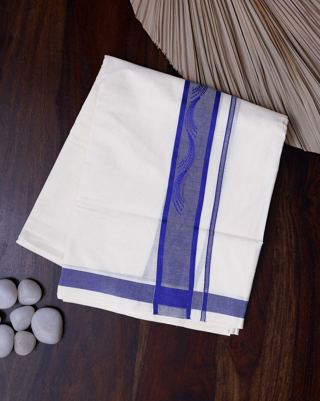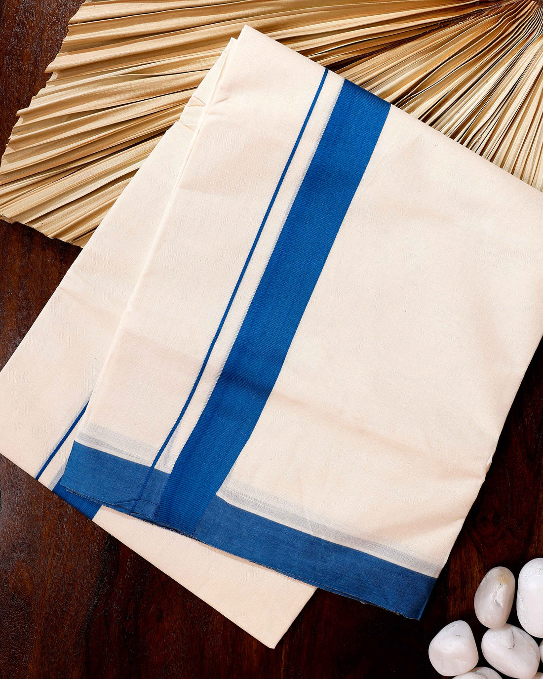 Traditional Handwoven Cotton Dhoti with Blue Border and Elegant Finish - Off White