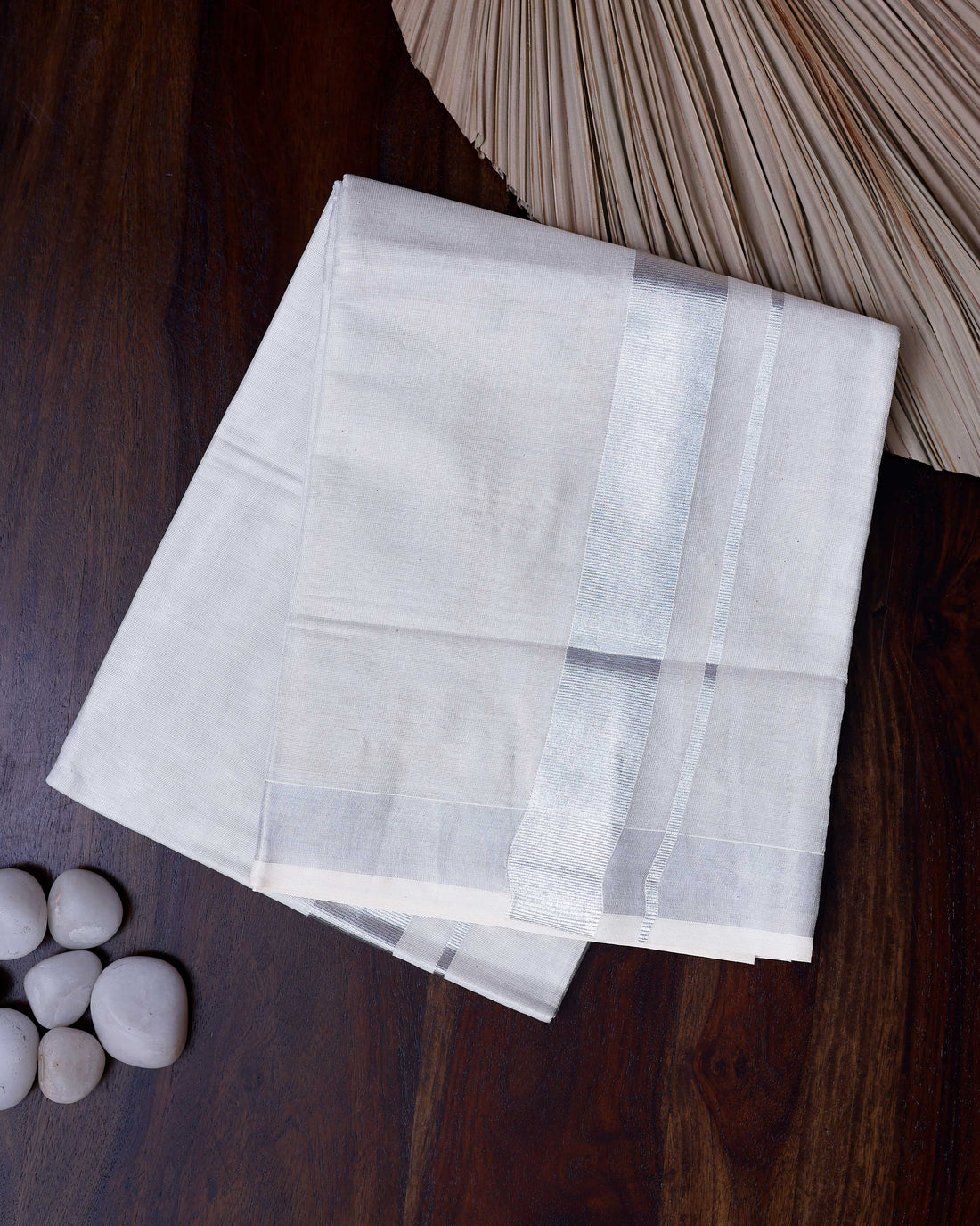 Men's Traditional Handwoven Cotton Dhoti with Silver Border and Elegant Finish - White