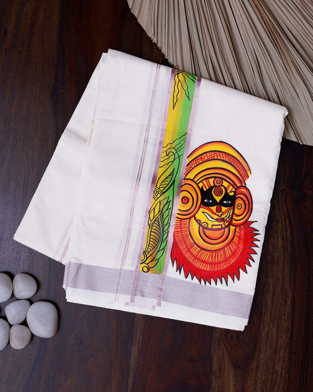 Men's Traditional Handpainted Kathakali Mural Kasavu Cotton Dhoti With Rose Gold Border - White