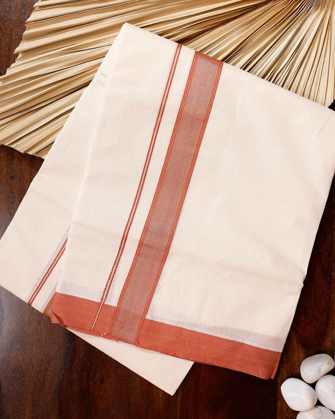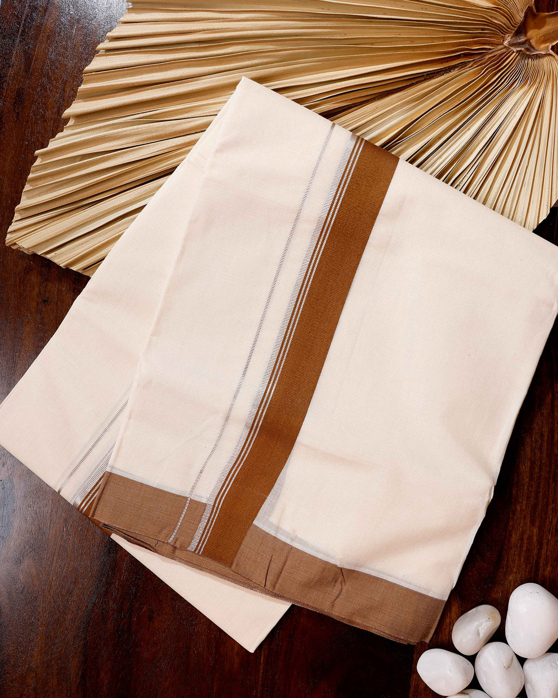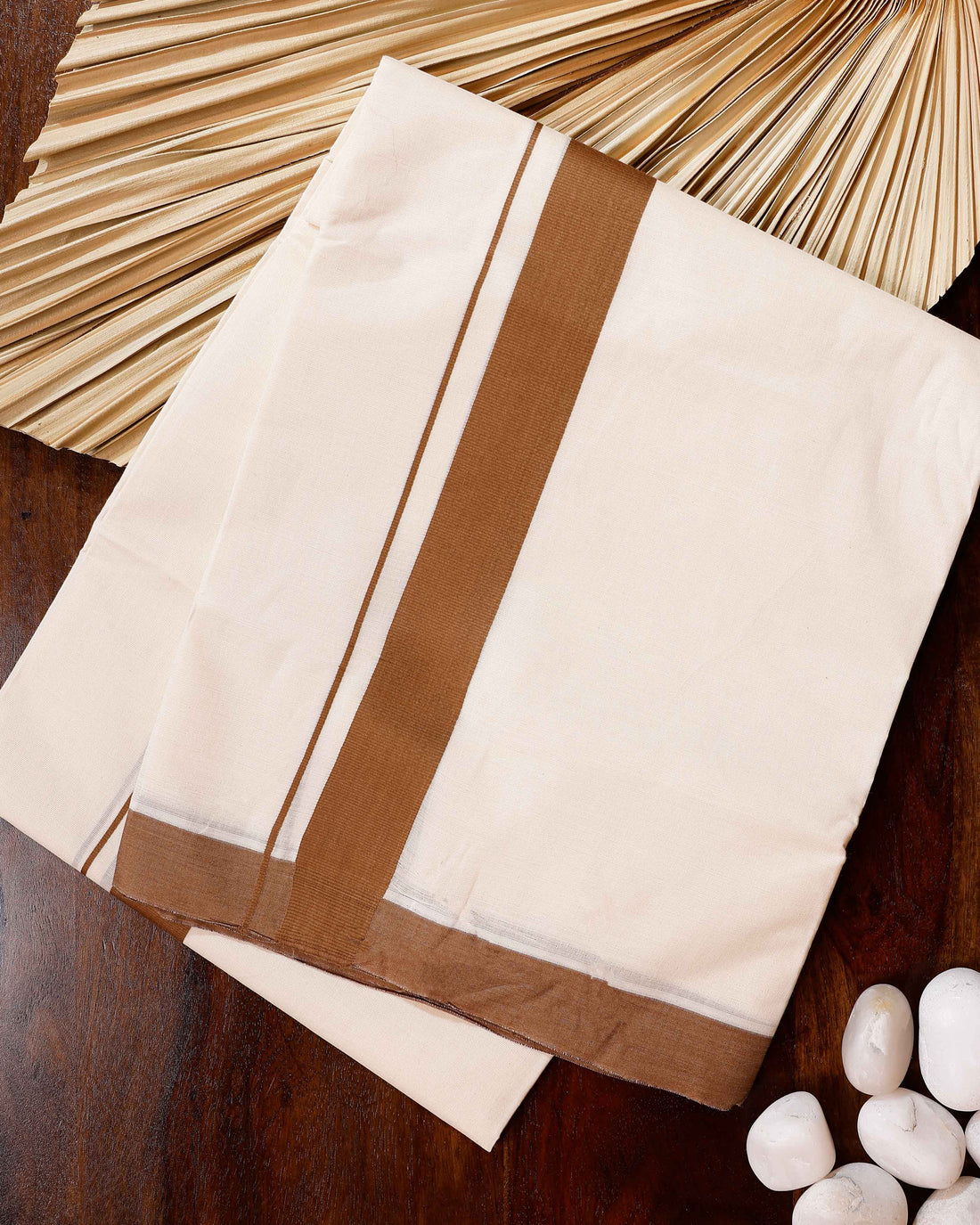 Traditional Handwoven Cotton Dhoti with Brown Border and Elegant Finish - Off White