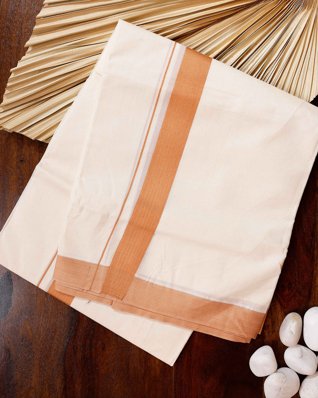Traditional Handwoven Cotton Dhoti with Peach Border and Elegant Finish - Off White