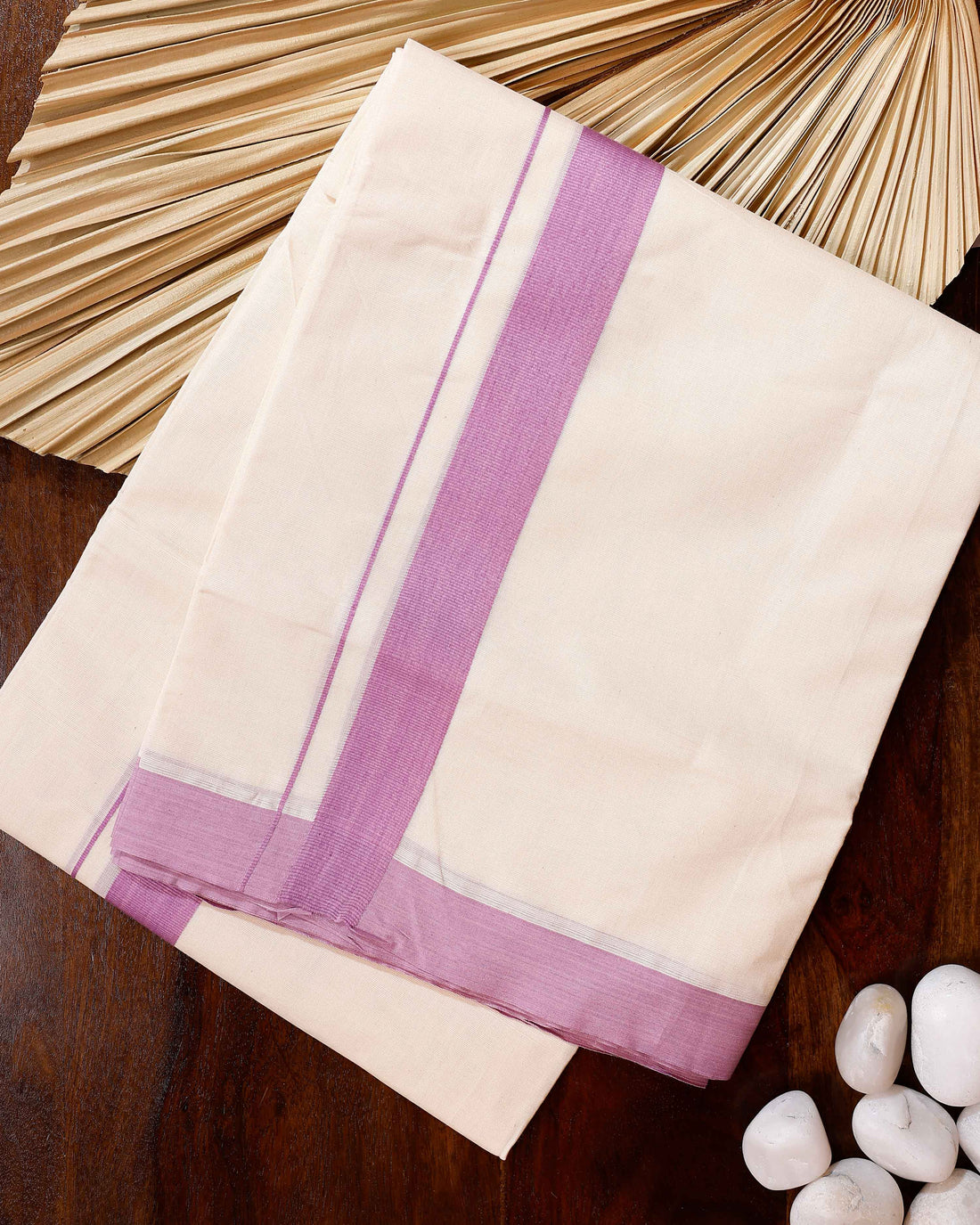 Traditional Handwoven Cotton Dhoti with Lavender Border and Elegant Finish - Off White