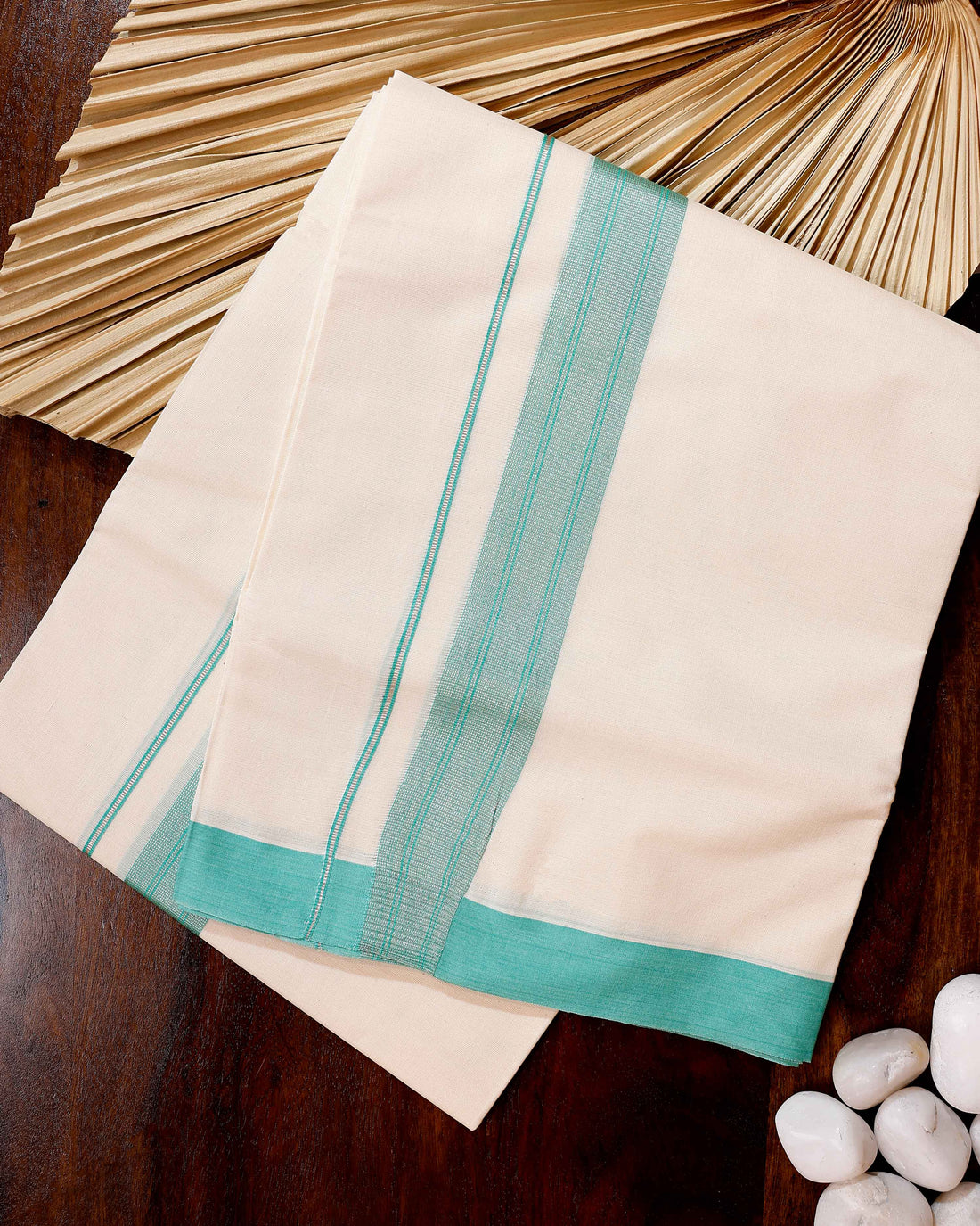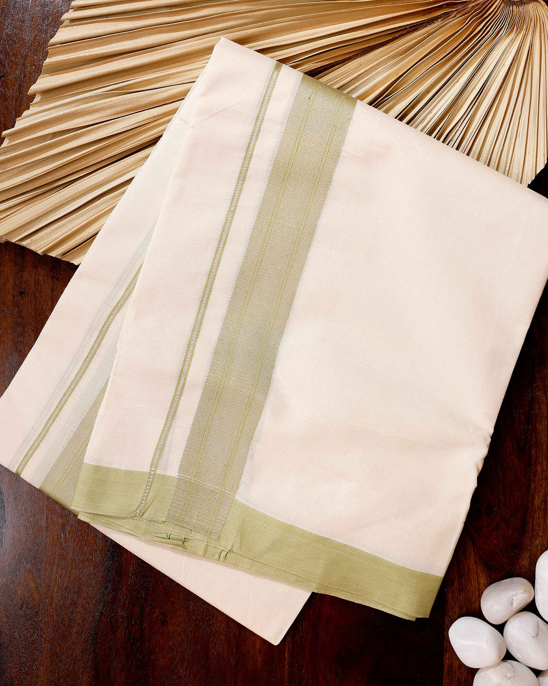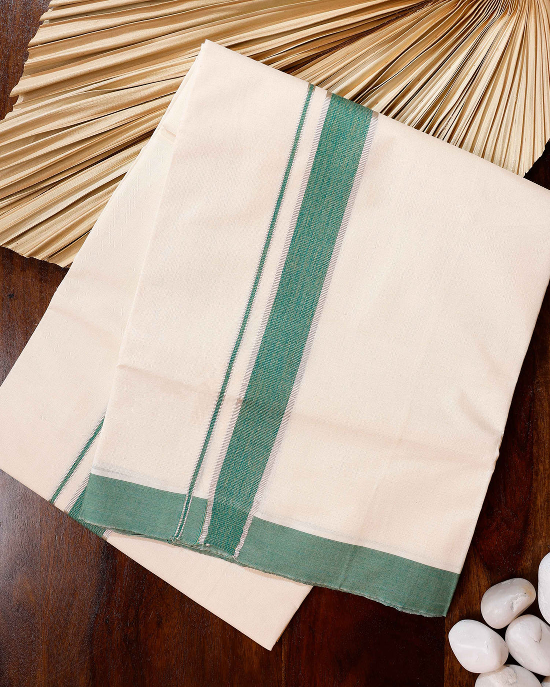 Traditional Handwoven Cotton Dhoti with Green Border and Elegant Finish - Off White