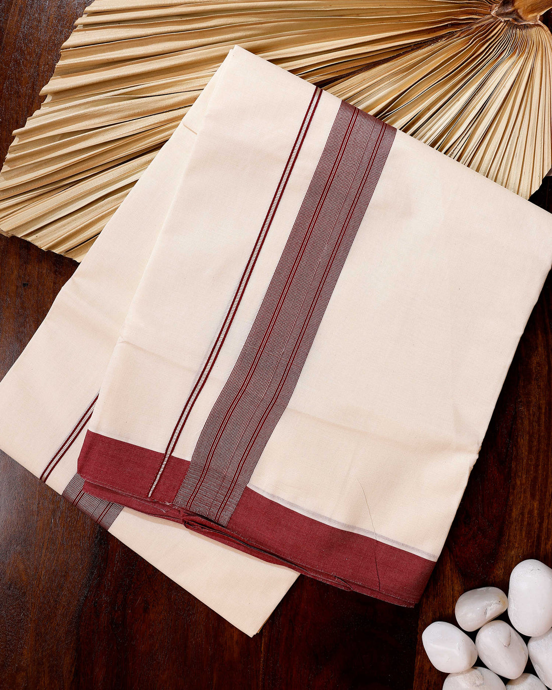 Traditional Handwoven Cotton Dhoti with Maroon Border and Elegant Finish - Off White