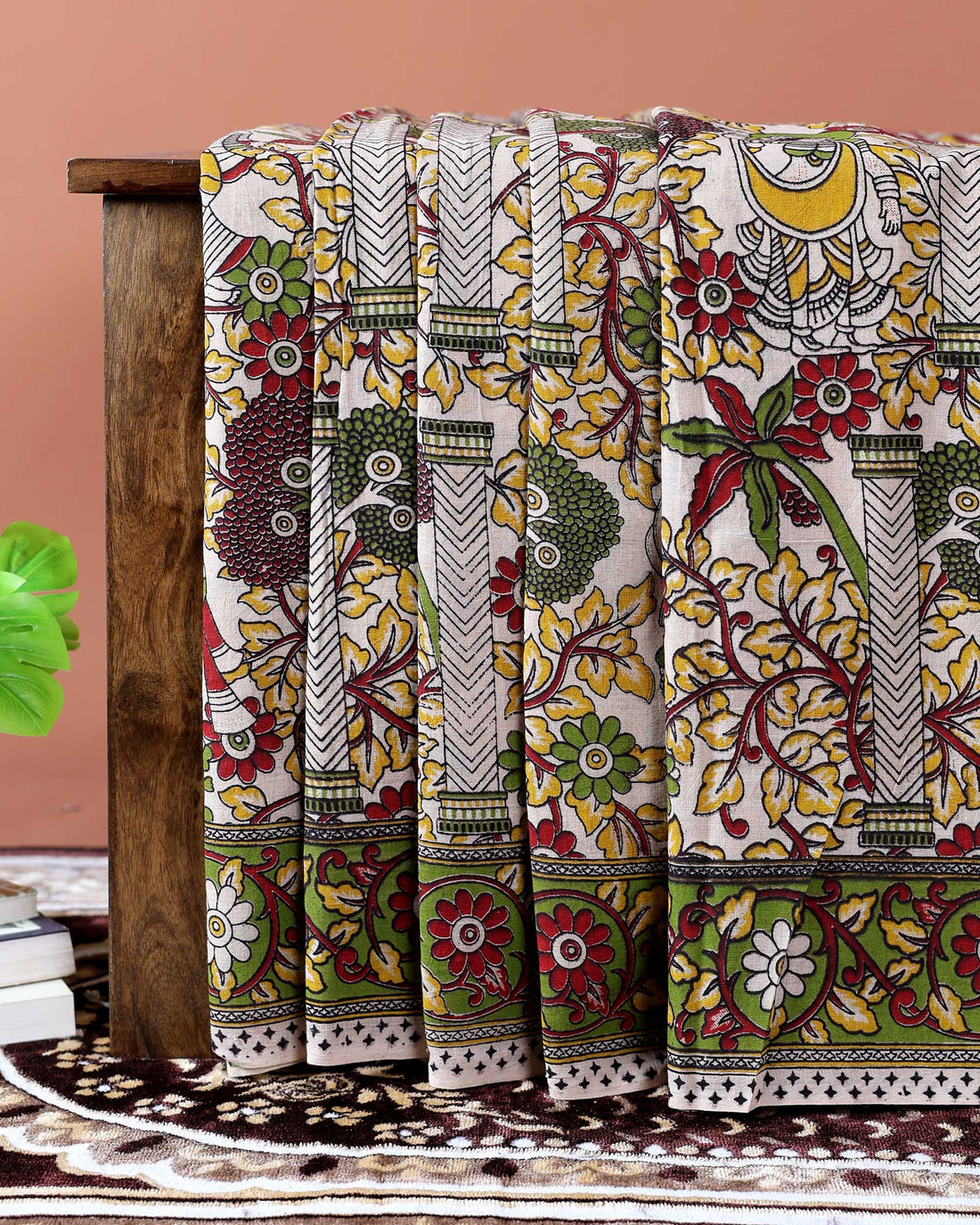 Traditional Kalamkari Print Cotton Saree with Floral Motifs - Cream