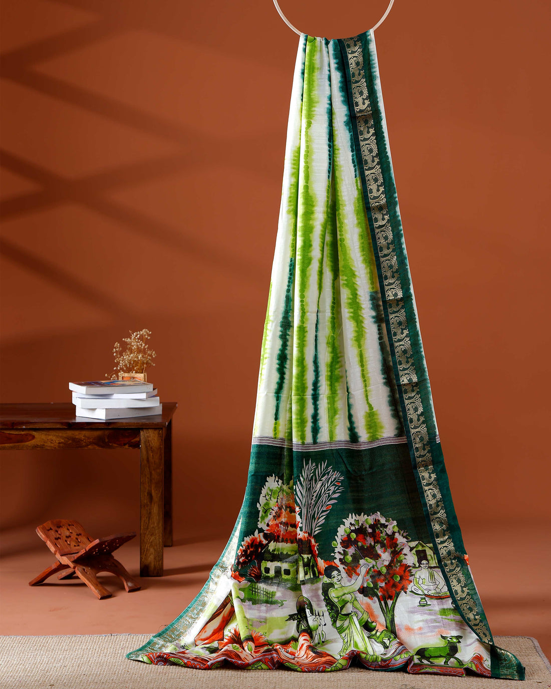 Elegant Dola Saree with Floral Motifs and Contrast Border - Green