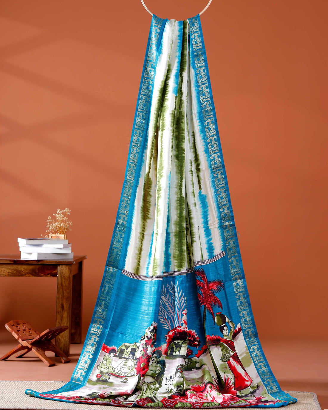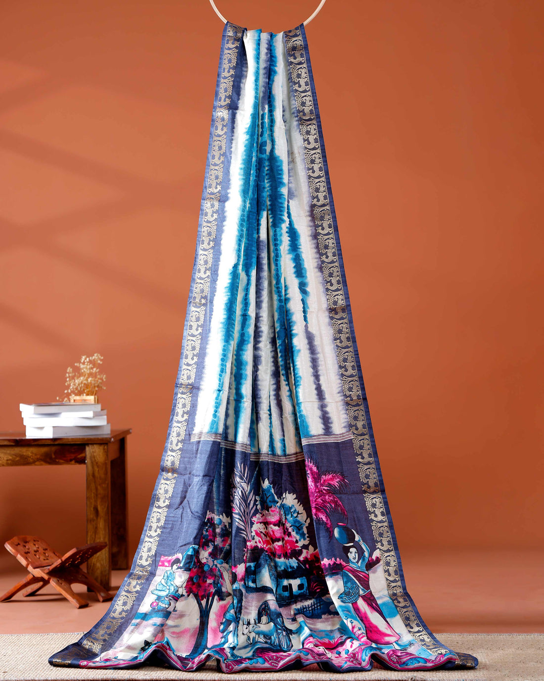 Elegant Blue shades and the rural scenic artwork Dola Saree