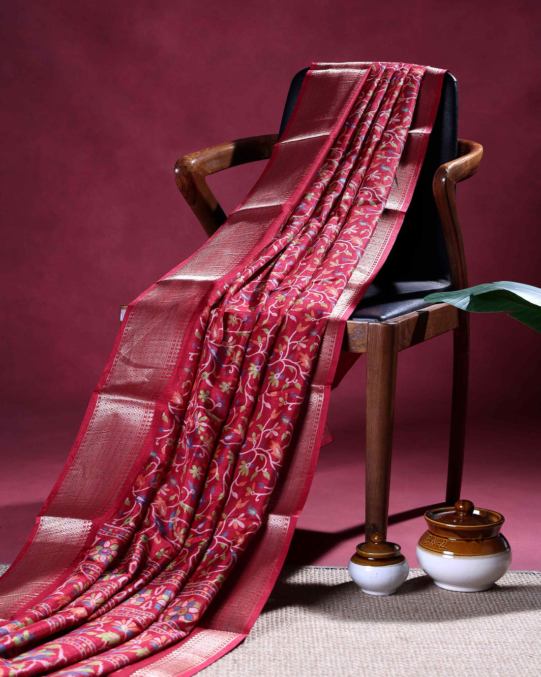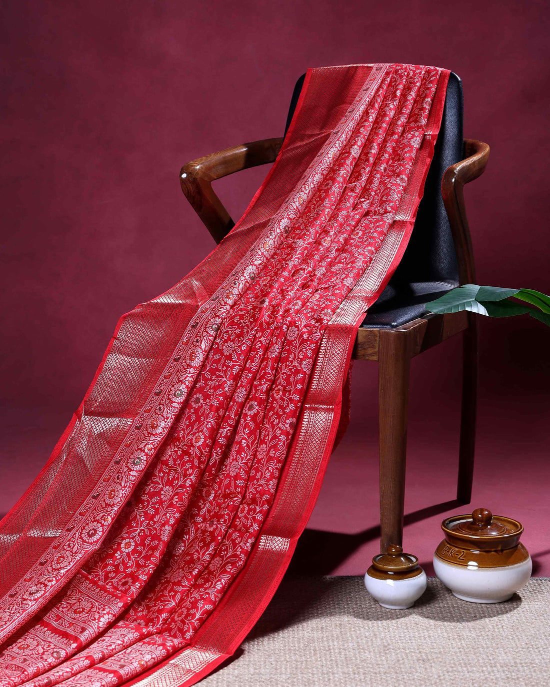 Traditional Dola Silk Saree with All-Over Floral Vine Motifs and Rich Traditional Zari Woven Border - Red