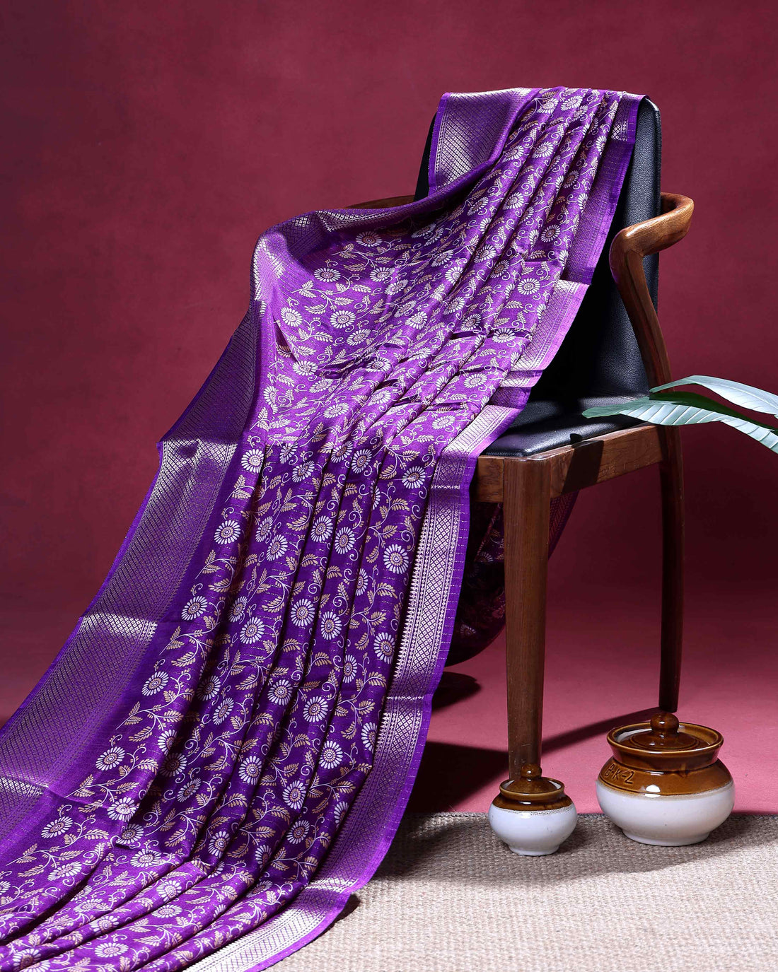 Elegant Dola Silk Saree with All-Over Floral Vine Motifs and Rich Traditional Zari Woven Border - Purple