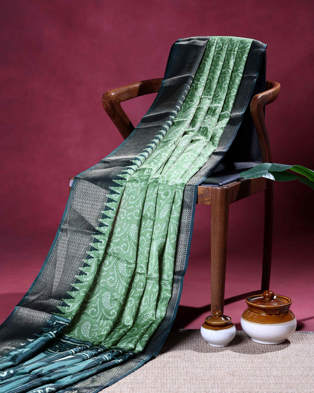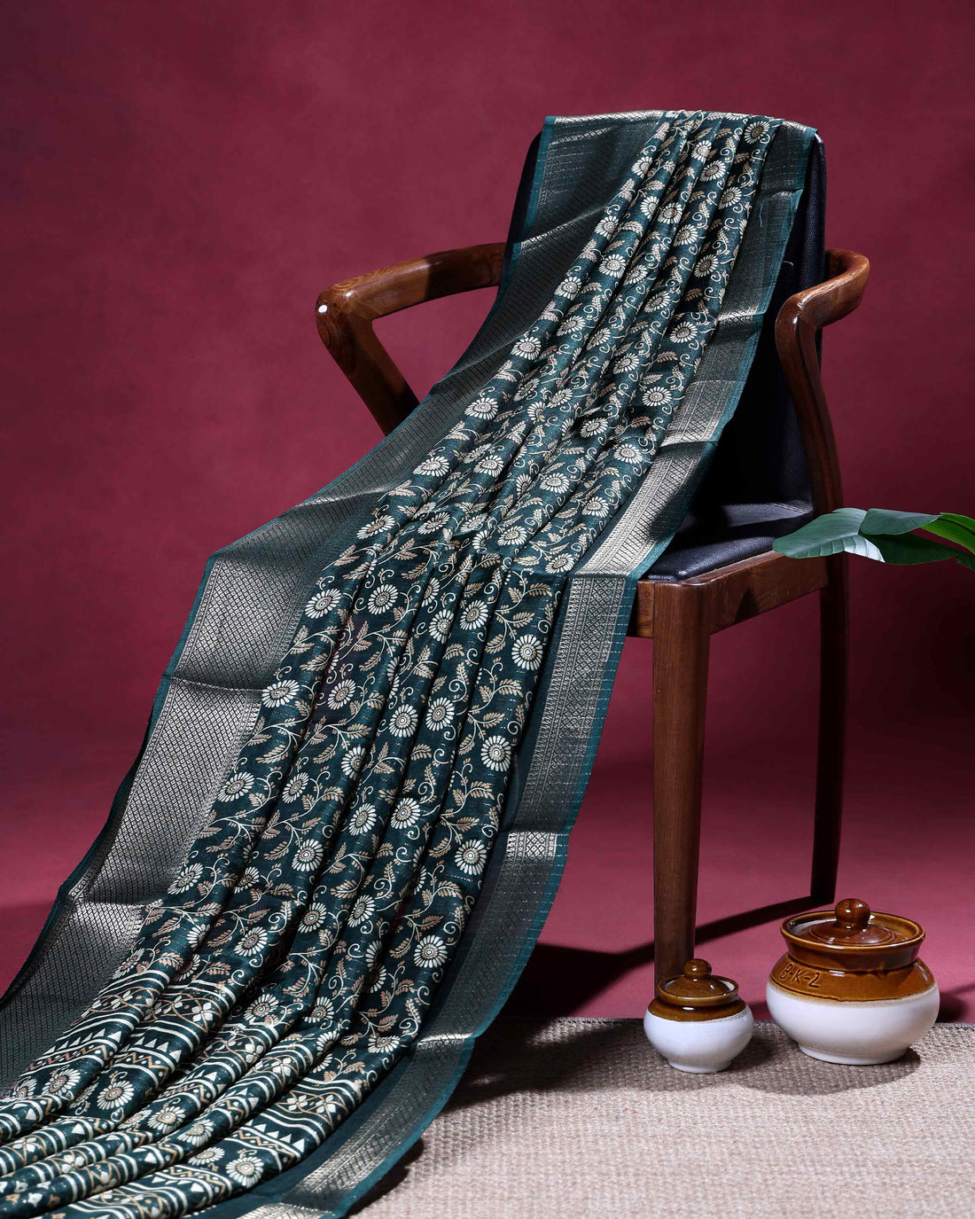 Elegant Dola Silk Saree with All-Over Floral Vine Motifs and Rich Traditional Zari Woven Border - Dark Green