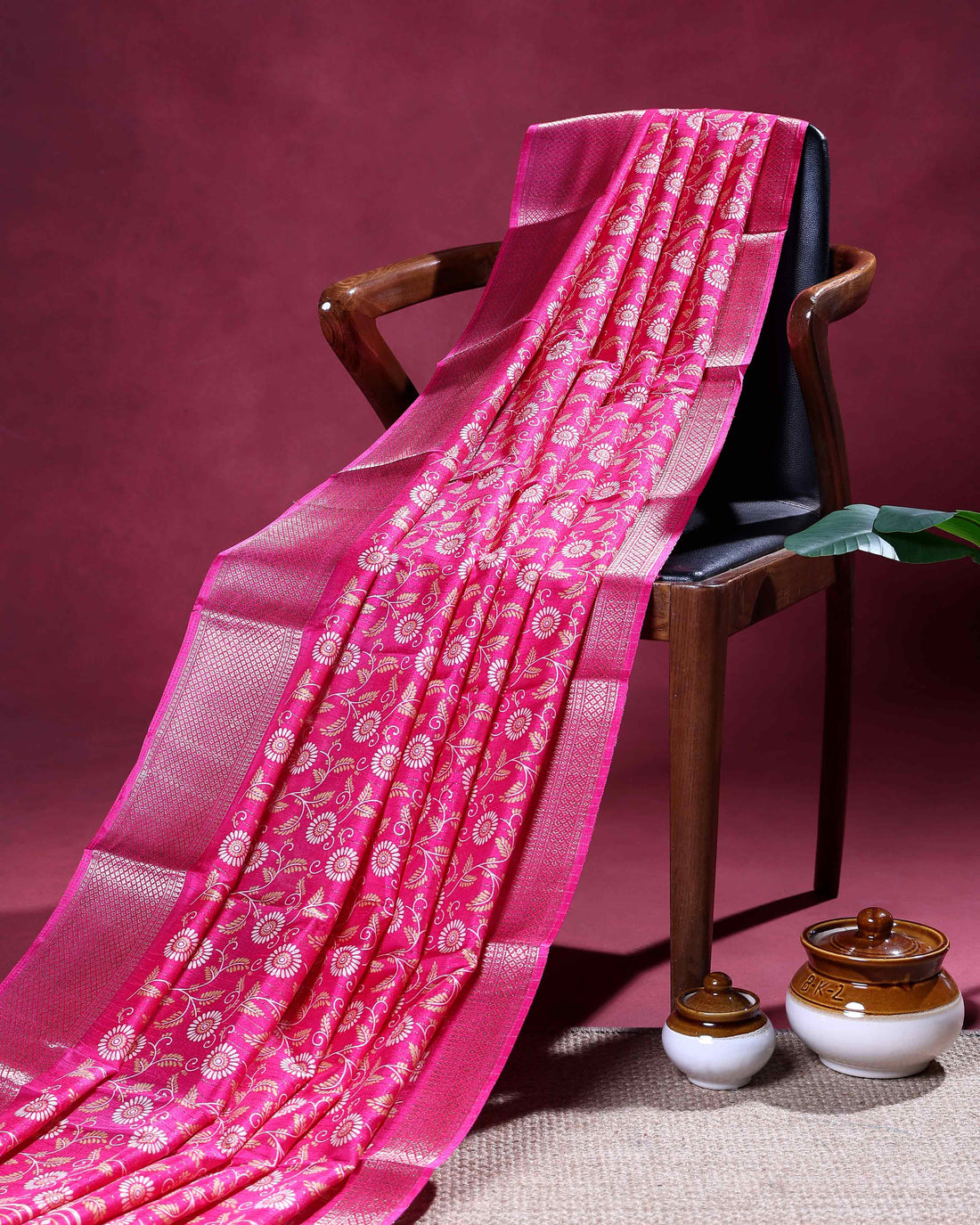 Traditional Dola Silk Saree with All-Over Floral Vine Motifs and Rich Traditional Zari Woven Border - Pink