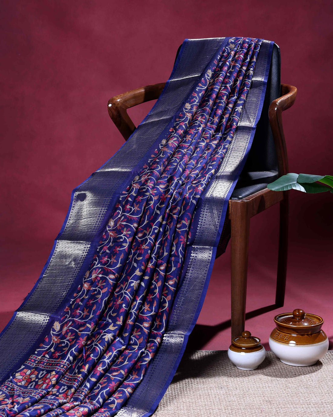 Elegant Dola Silk Saree with All-Over Floral Vine Weaving and Rich Traditional Zari Border with Contrast Pallu - Navy Blue