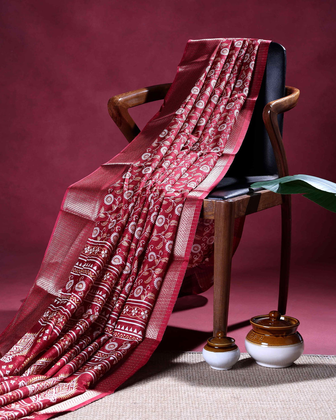 Elegant Dola Silk Saree with All-Over Floral Vine Motifs and Rich Traditional Zari Woven Border - Maroon