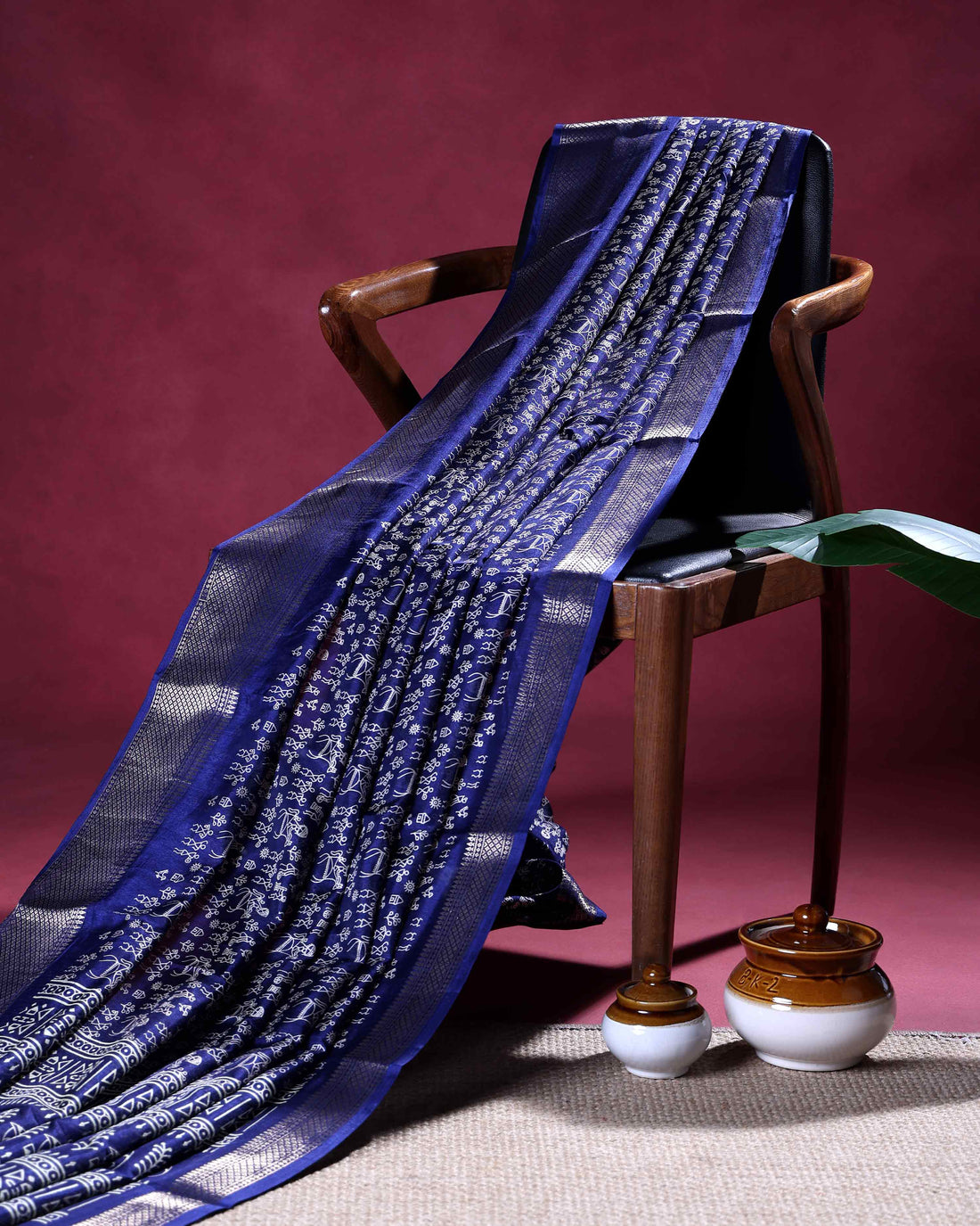 Elegant Dola Silk Saree with Intricate Geometric and Floral Motif Weaving and Classic Zari Woven Border - Navy Blue