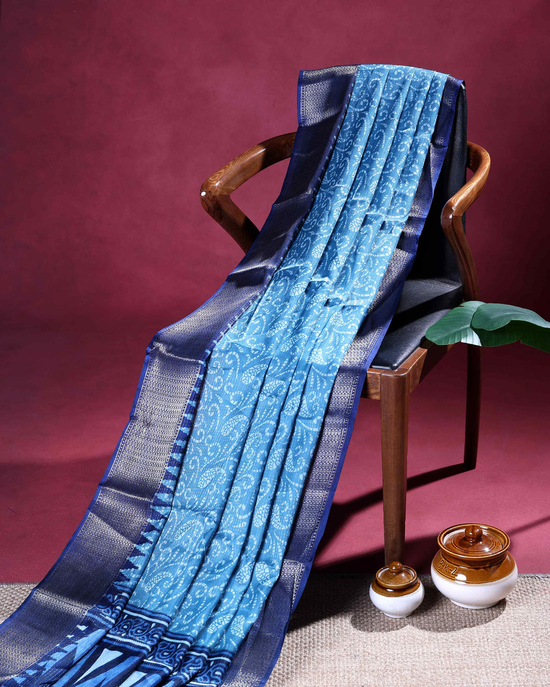 Premium Dola Silk Saree with Intricate Floral Vine Weave and Zari Border - Light Blue
