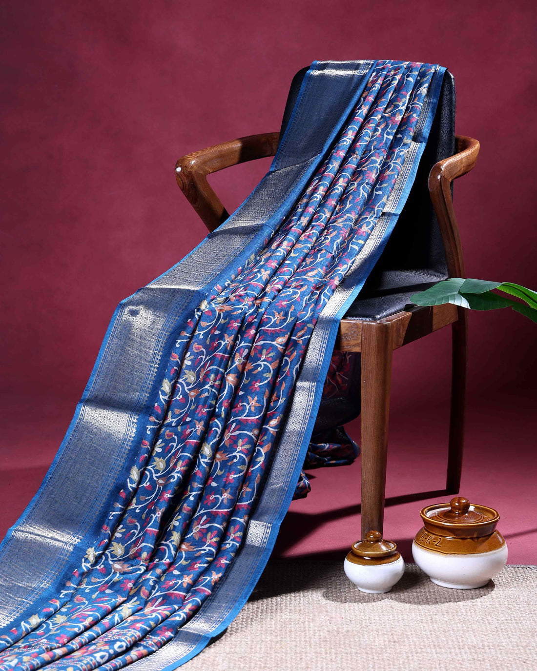 Elegant Dola Silk Saree with All-Over Floral Vine Weaving and Rich Traditional Zari Border with Contrast Pallu - Dark Blue