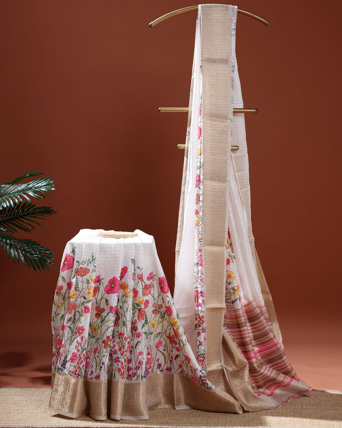 Elegant Floral Pattern Dola Silk Saree With Woven Border - White