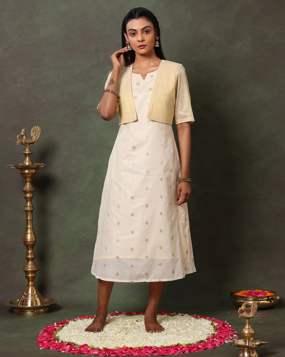 Elegant A-Line Dress with Striped Open Jacket With V-Neck Ethnic - Cream