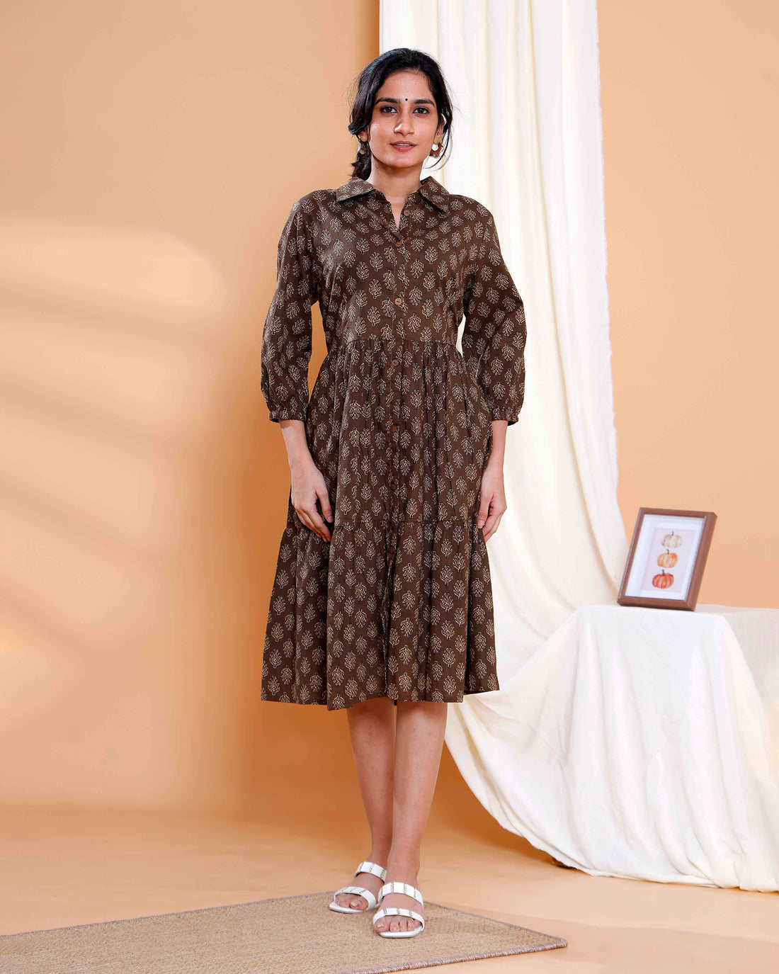 Elegant Brown Cotton Dress with Beige Leaf Motifs and Gathered Waist