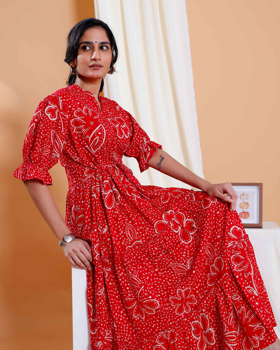 Elegant Red Long Dress with White Leaf Motifs and Flared Hem