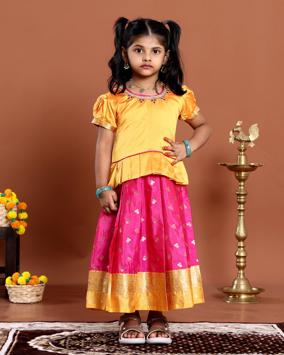 Classic Kids Readymade Pattu Pavadai with Contrast Blouse and Zari Woven Skirt - Yellow