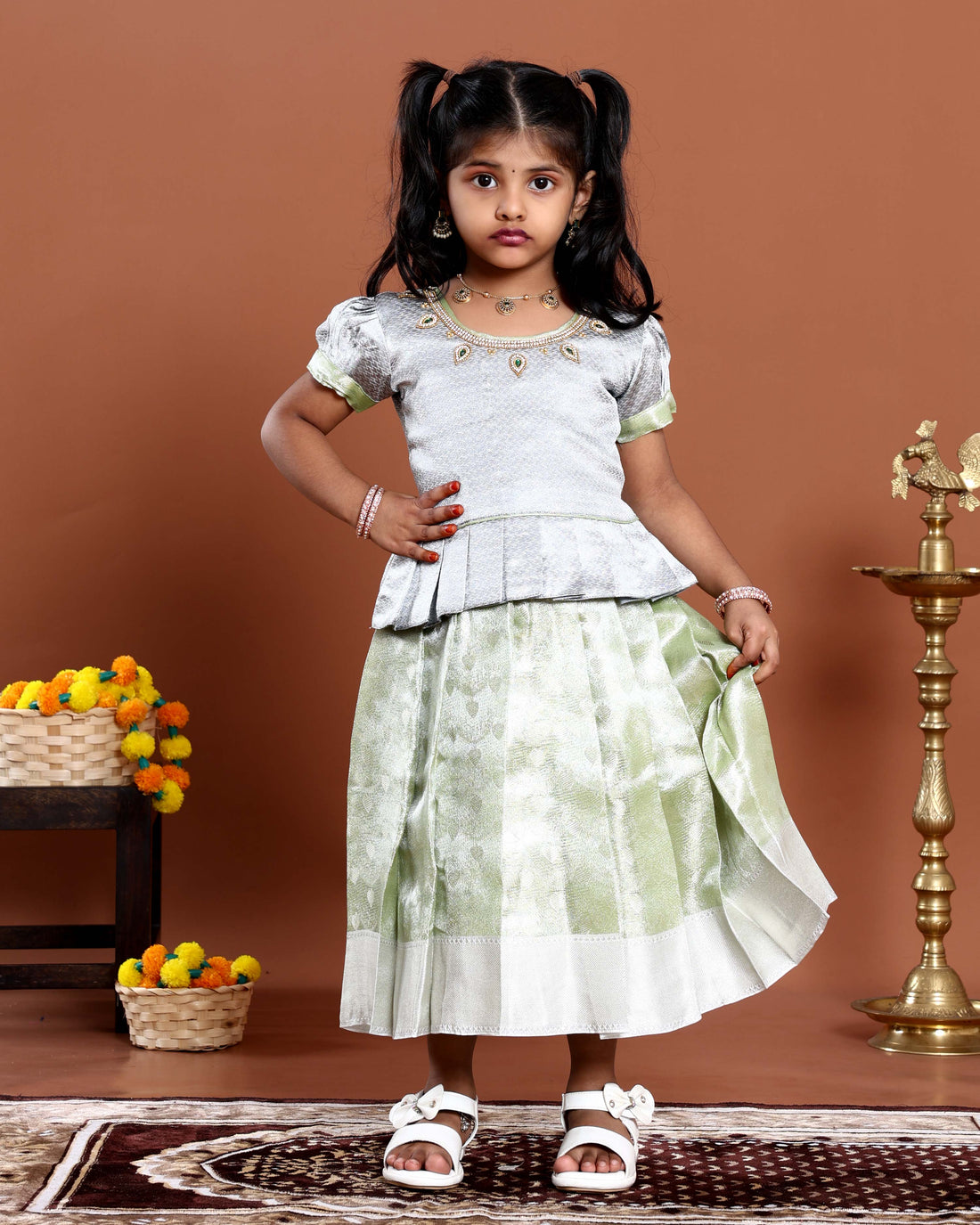 Traditional Kids Readymade Pattu Pavadai Set with Embellished Neck Blouse and Pleated Silk Skirt - Grey