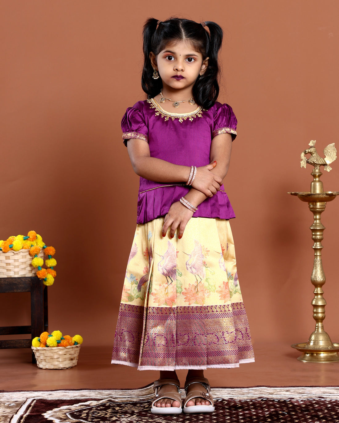 Elegant Kids Readymade Pattu Pavadai with Traditional Peacock Motif Skirt - Purple